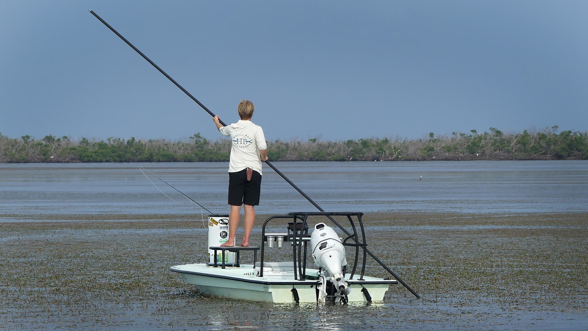 I can tell you what you canât pole a HPX 18 with a 150 Yamaha in . 3 people, 30 gallons of gas, full ice chest is about 10ish inches. Yes you can pole it for 9 hours a day