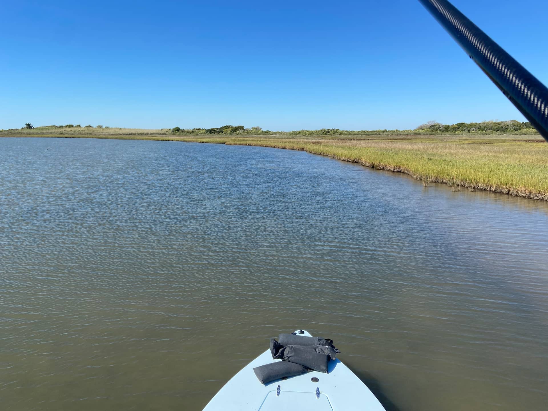 Got out solo last Friday. Was poling along and glided to a stop, so I figured I’d snap a pic of how much water I was in. The glue ring above the joint of the push pole foot is a little under 6 inches. With 100 lbs of sandbags on the front, I wasn’t quite balanced out. With another 50 lbs up front, easily a 5 1/2 inch skiff.