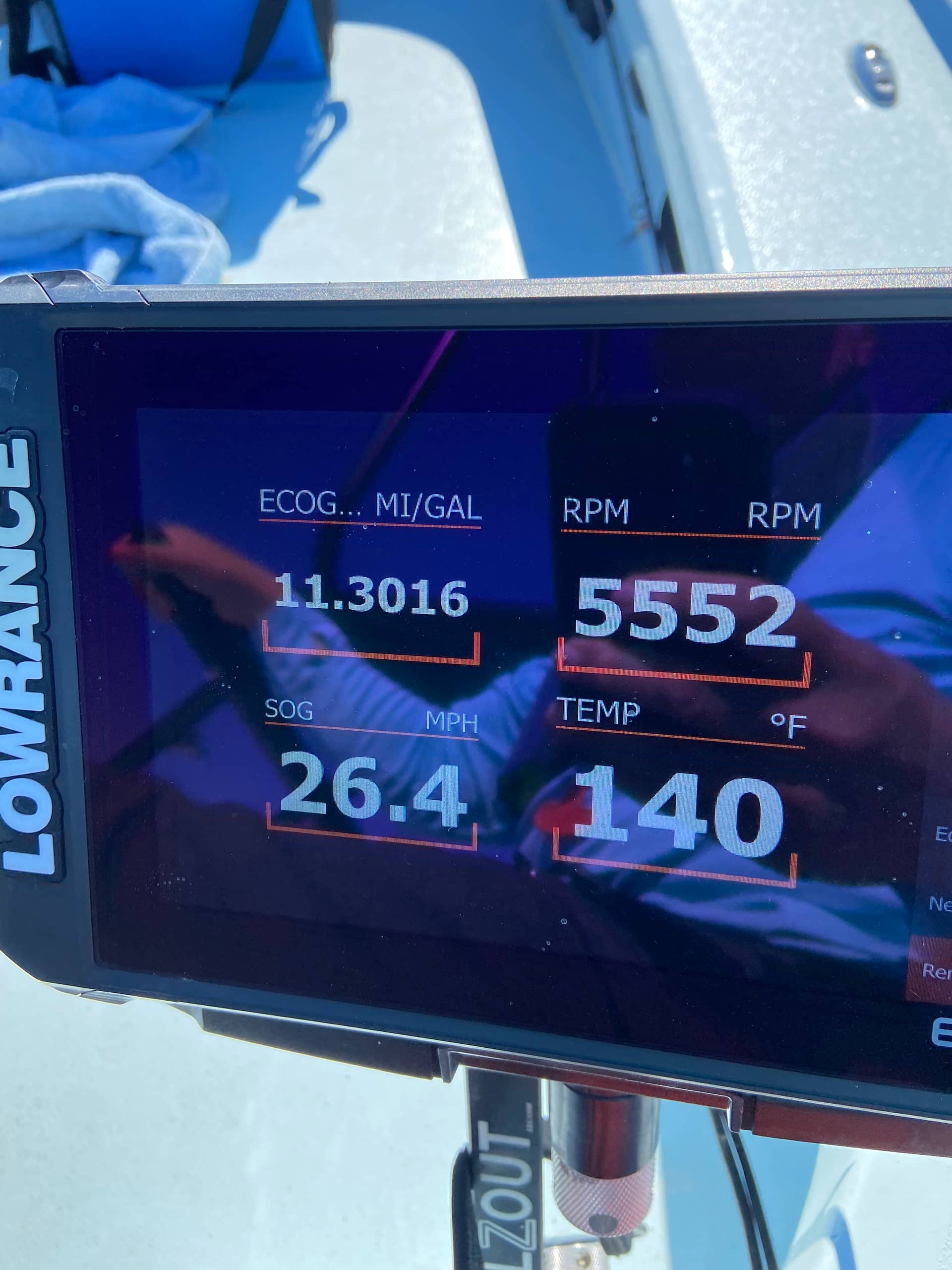 On the way back to the ramp. 30 horse Tohatsu. 11.3 mpg at 26 mph. I was in the sweet spot and just kept it there, but I have hit 30 mph before at the WOT rpm at 6,500 rpms.