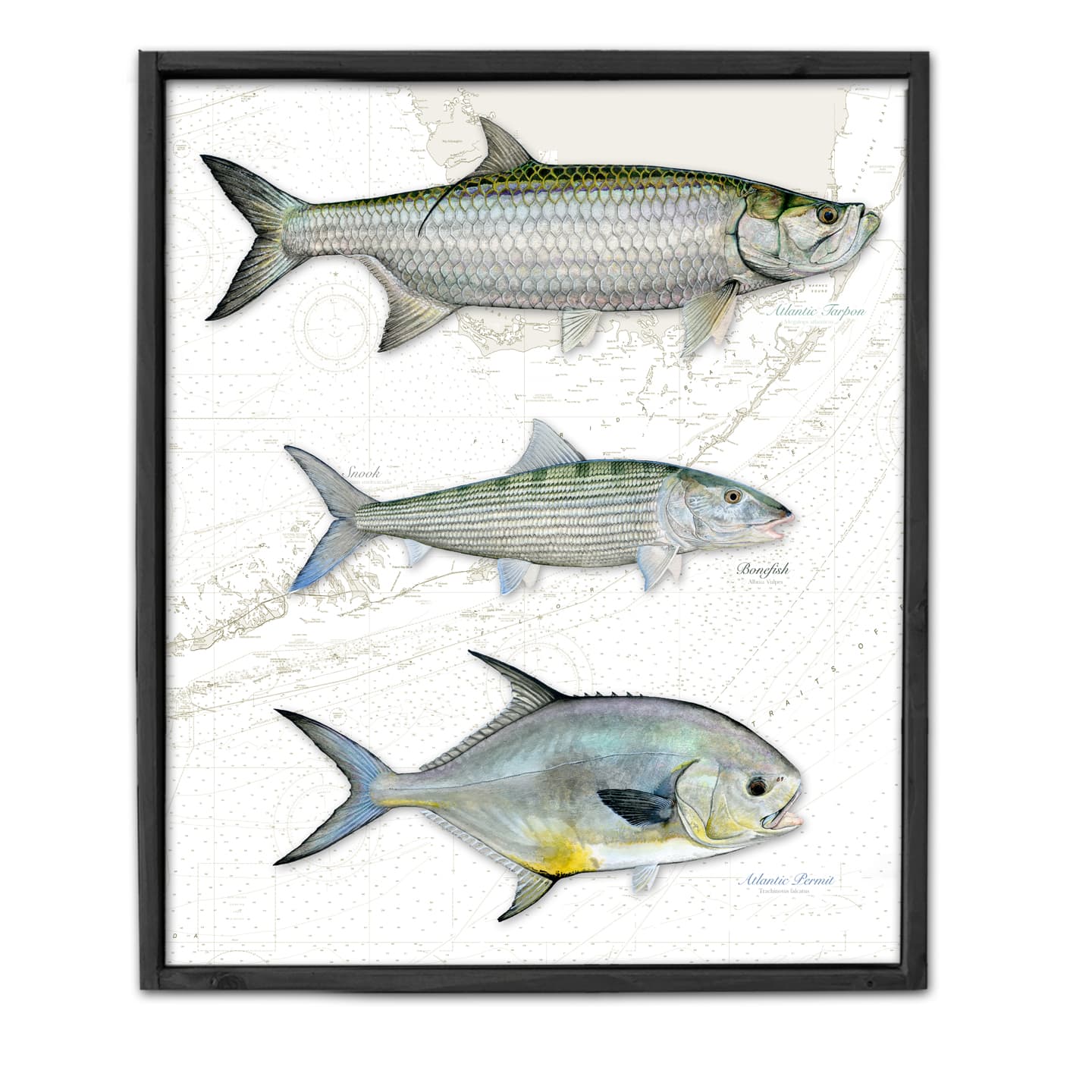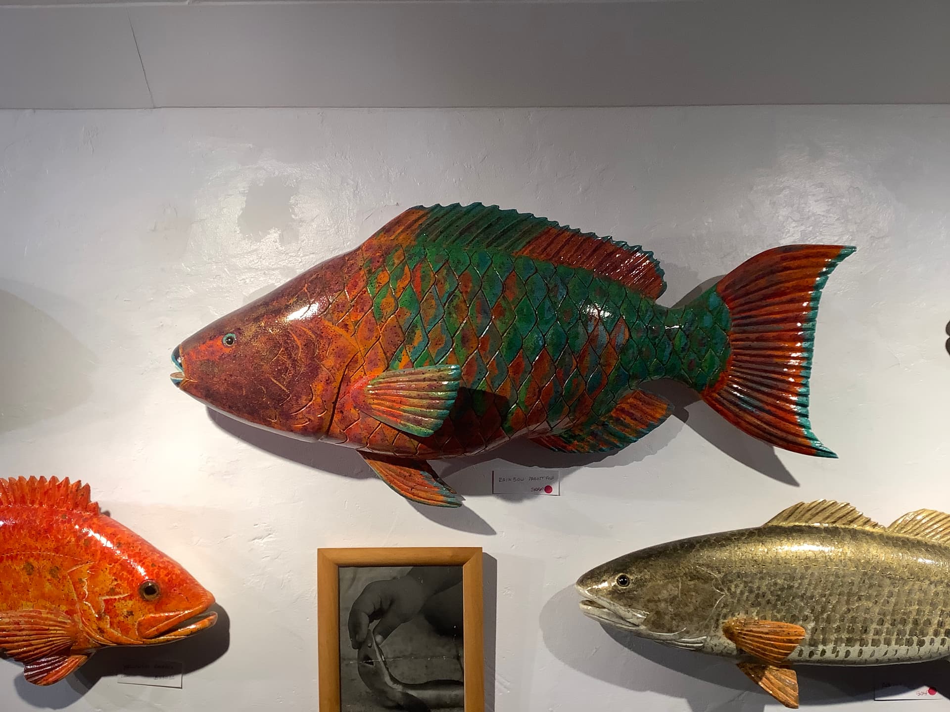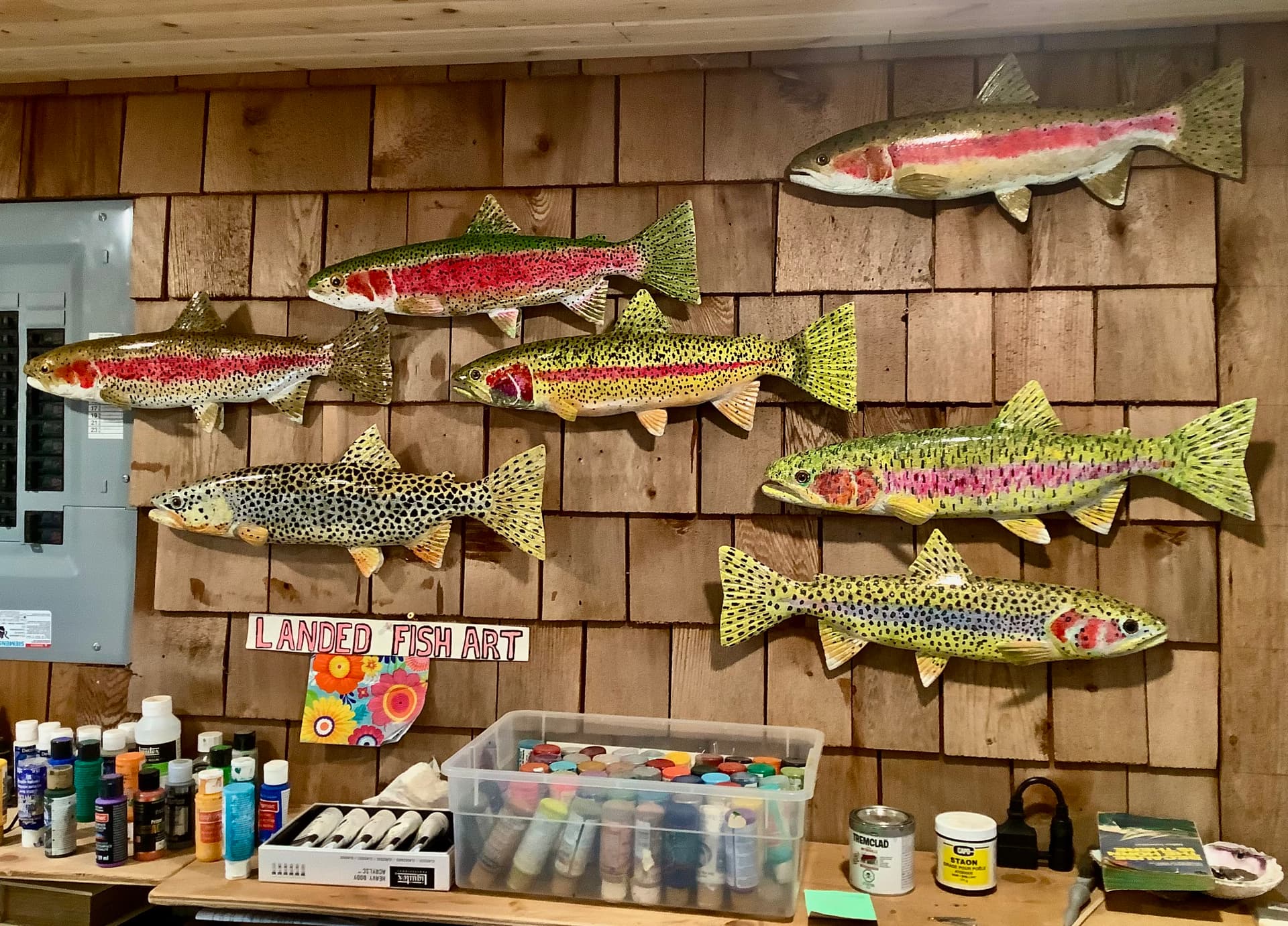 Here’s some of my latest fish paintings of my latest paintings of fish on carved wood.