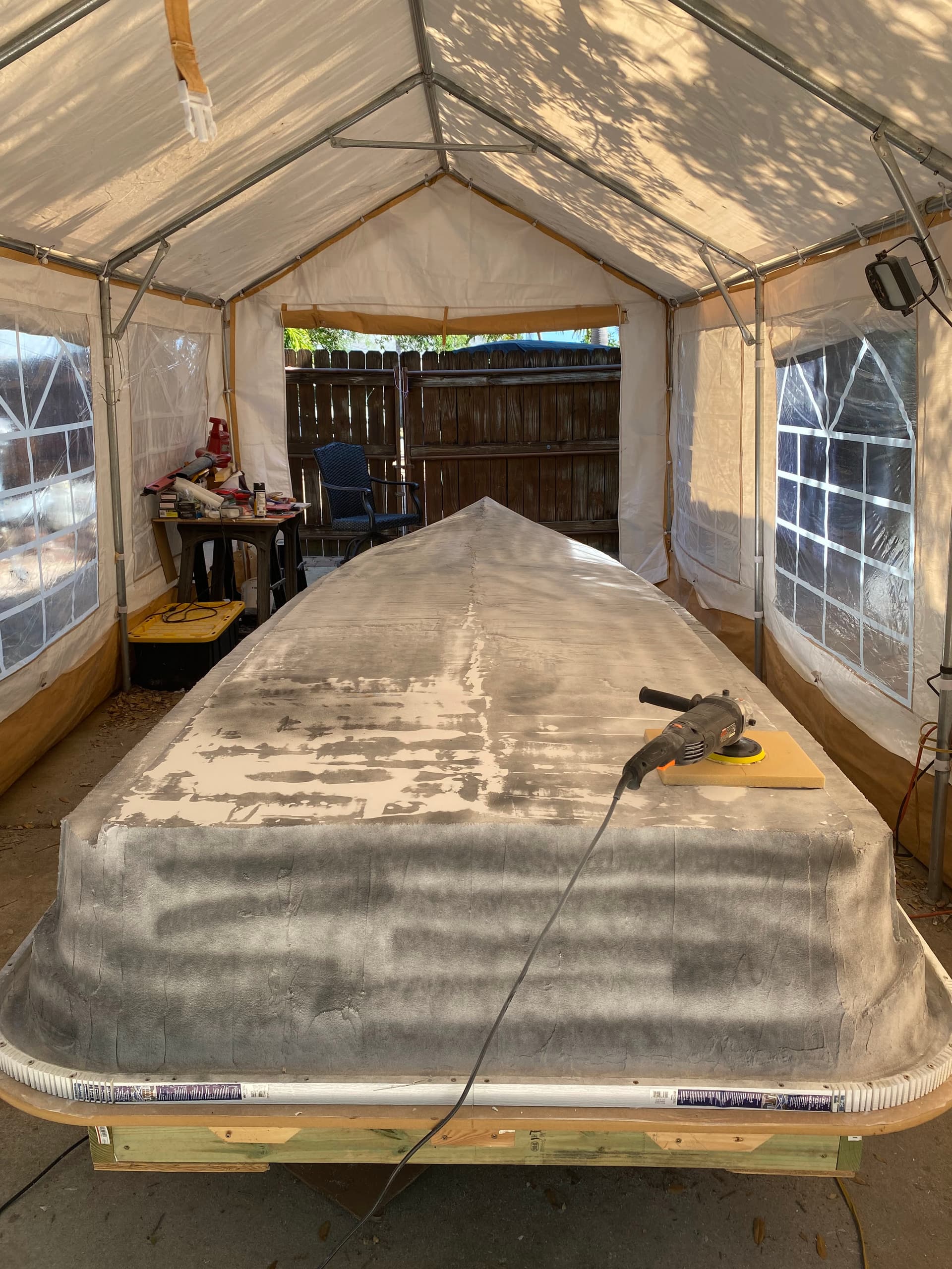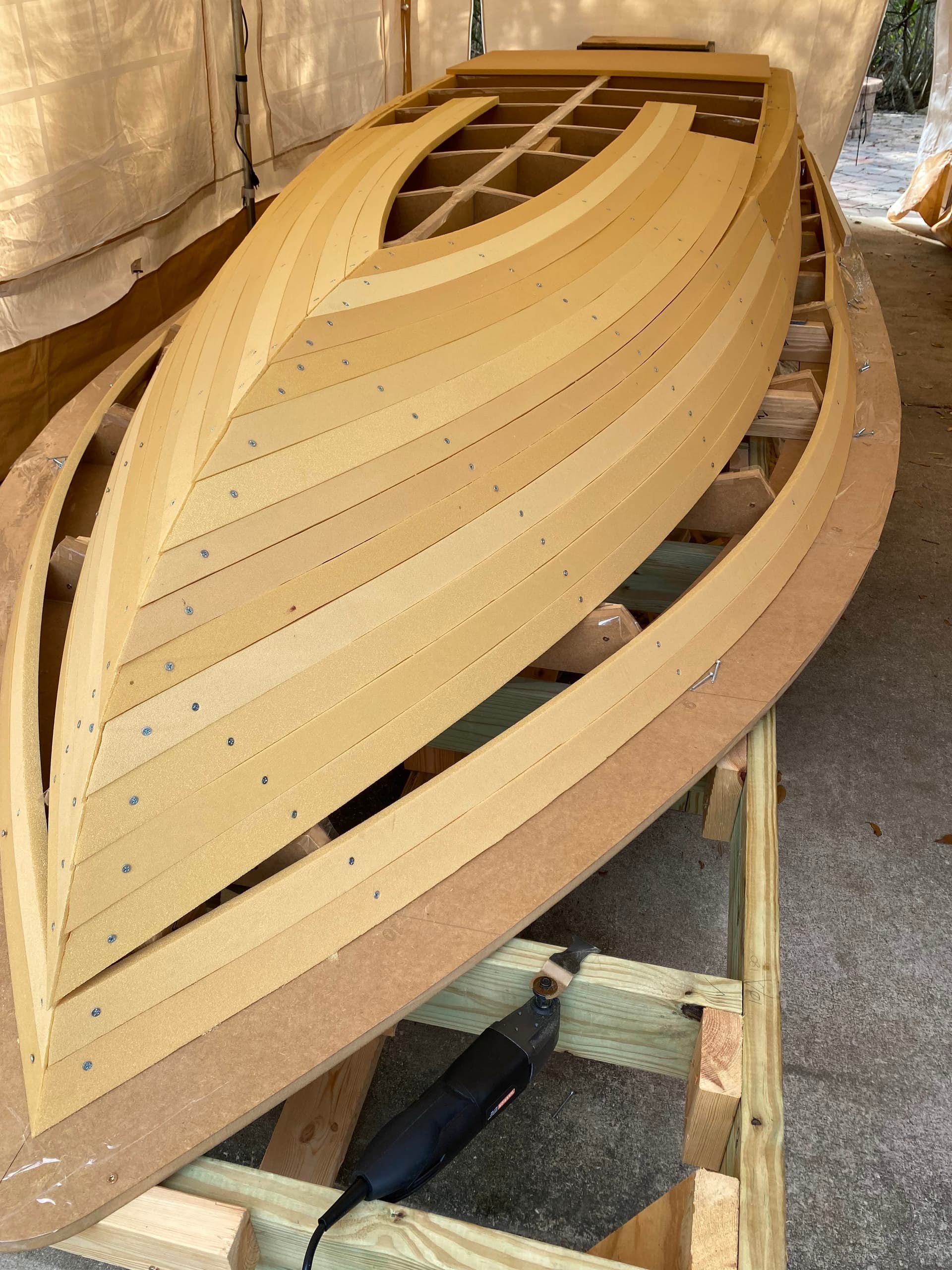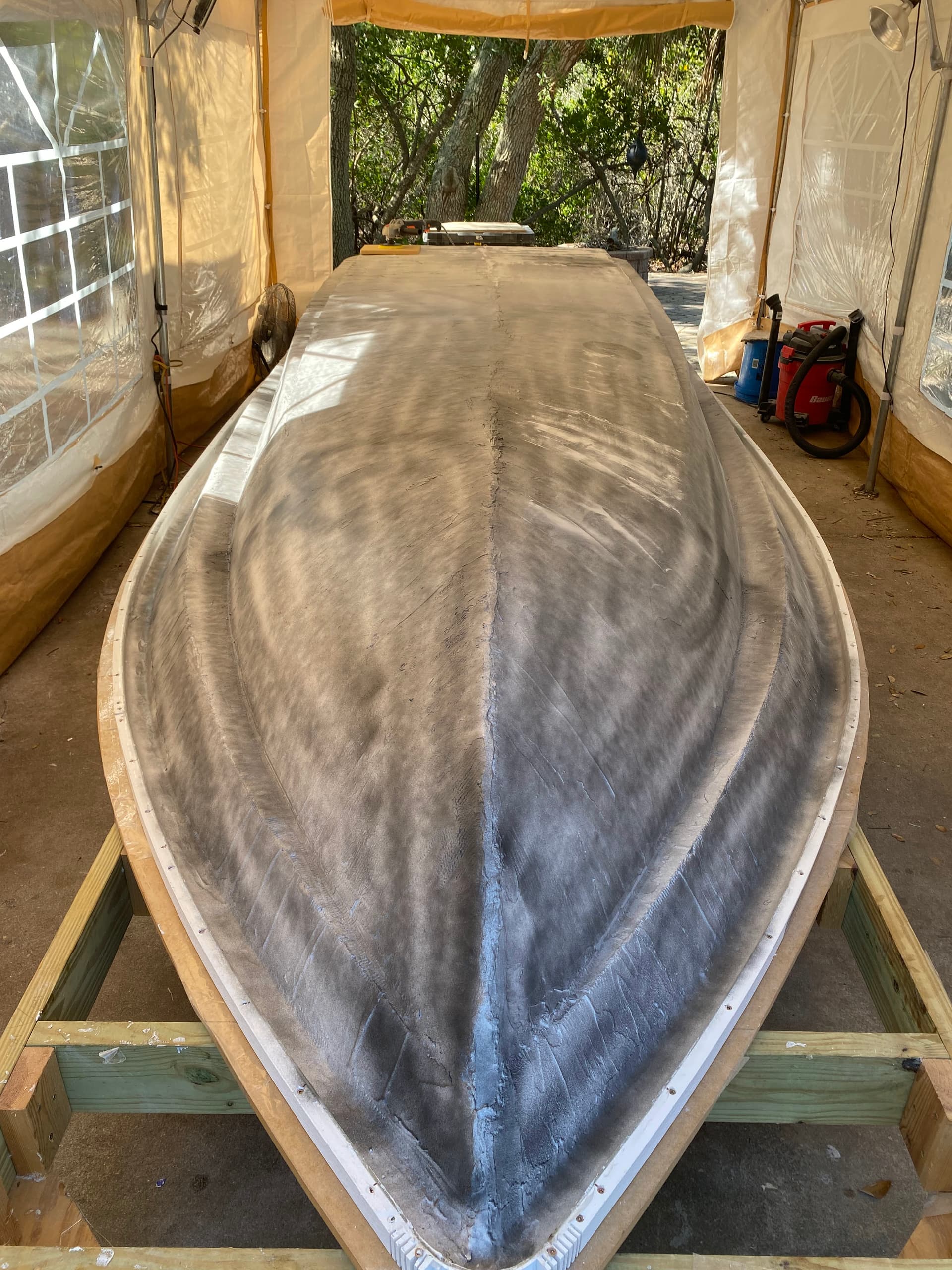 strong textSkim coated most of hull with Awlfair to fill impefections and pin holes (many). Rounded off outside corners of low chine and spray chine. The grey is high density putty applied after hull was glassed on the outside corners.