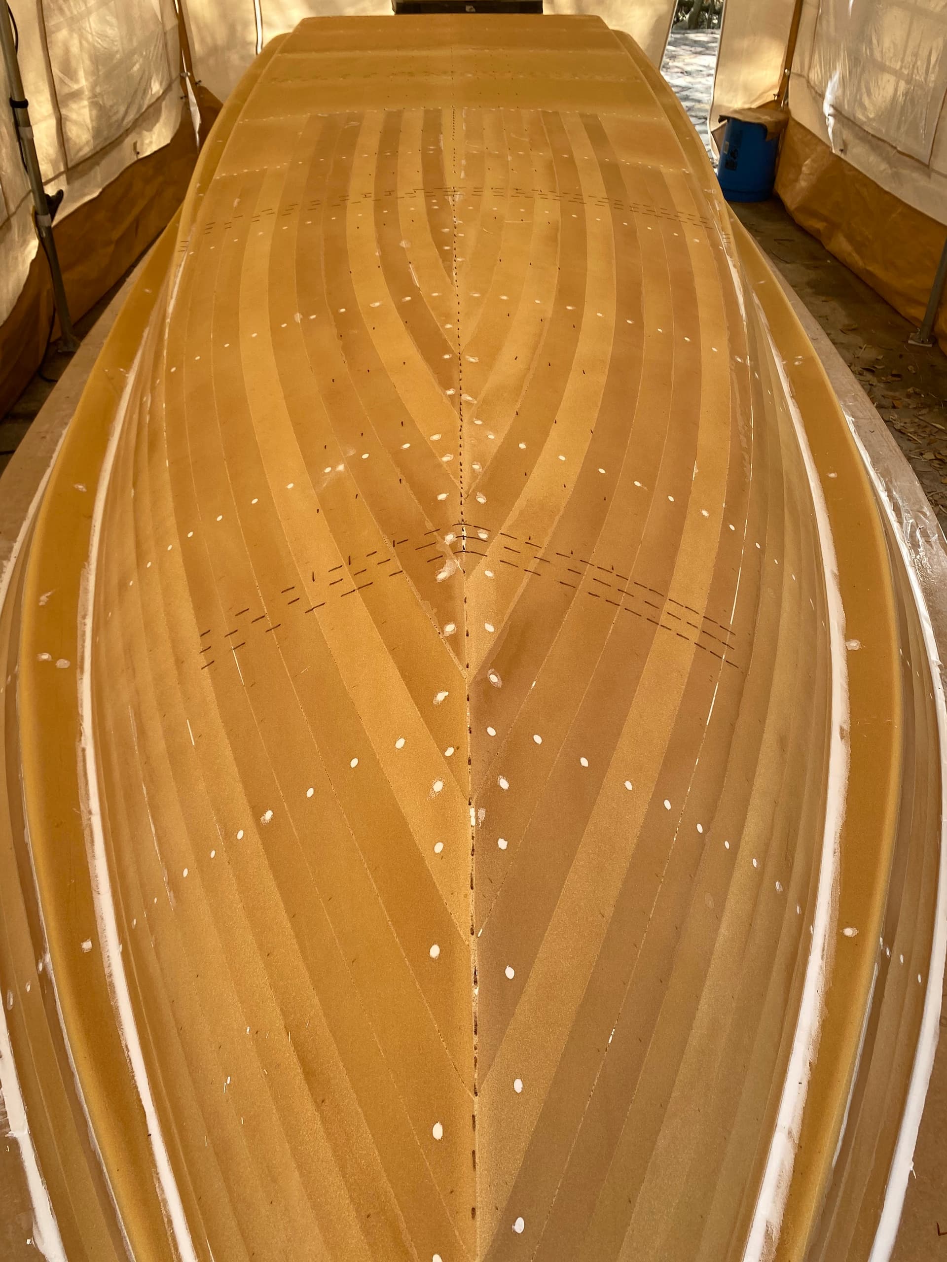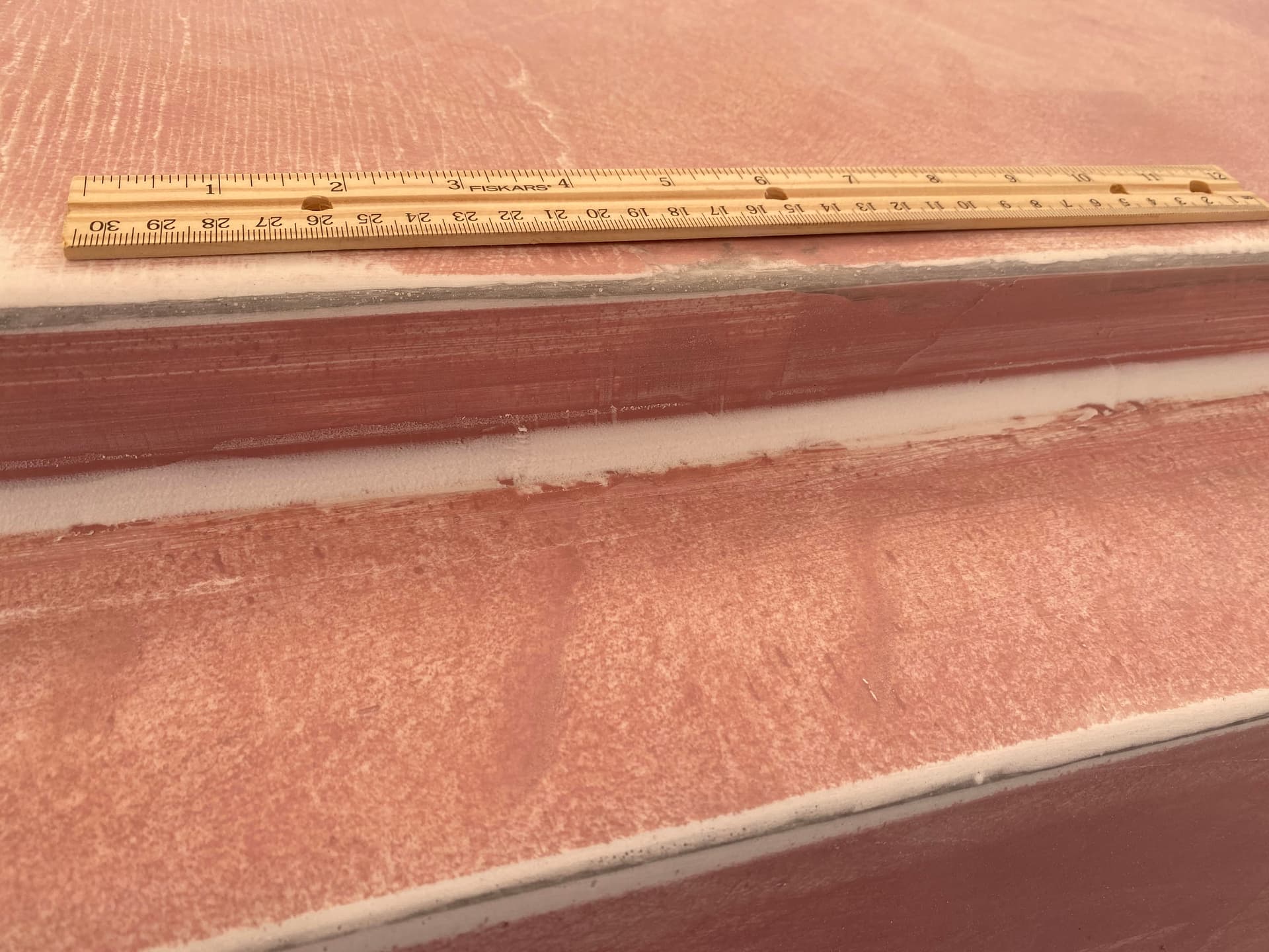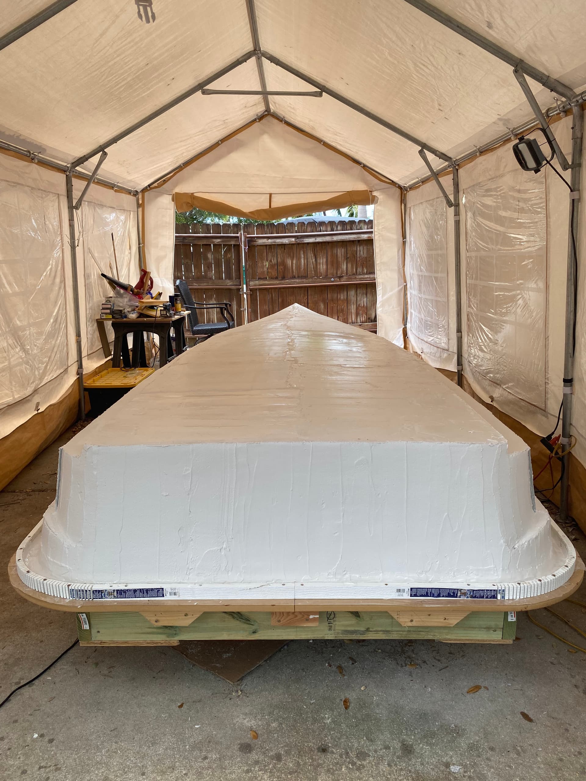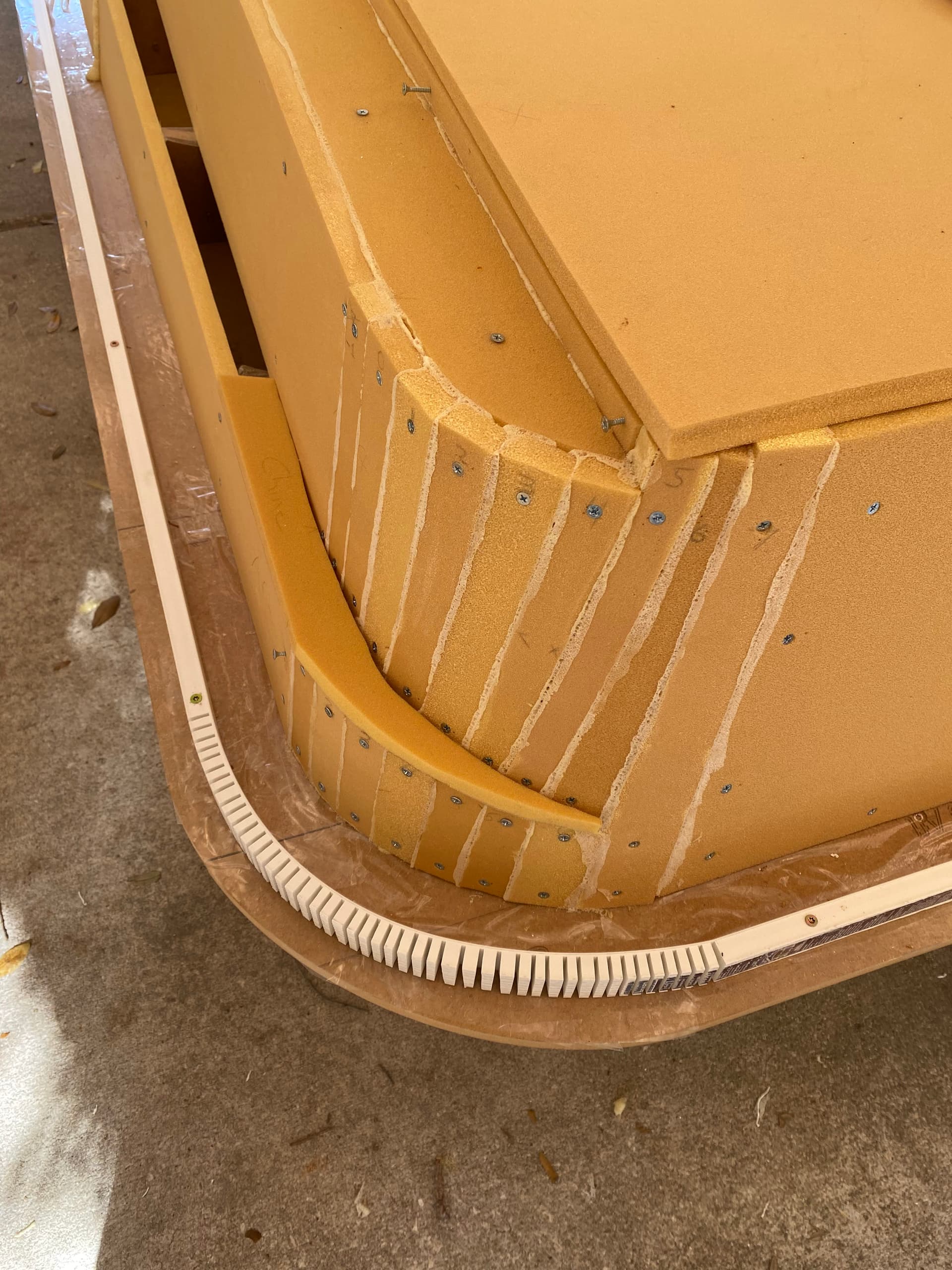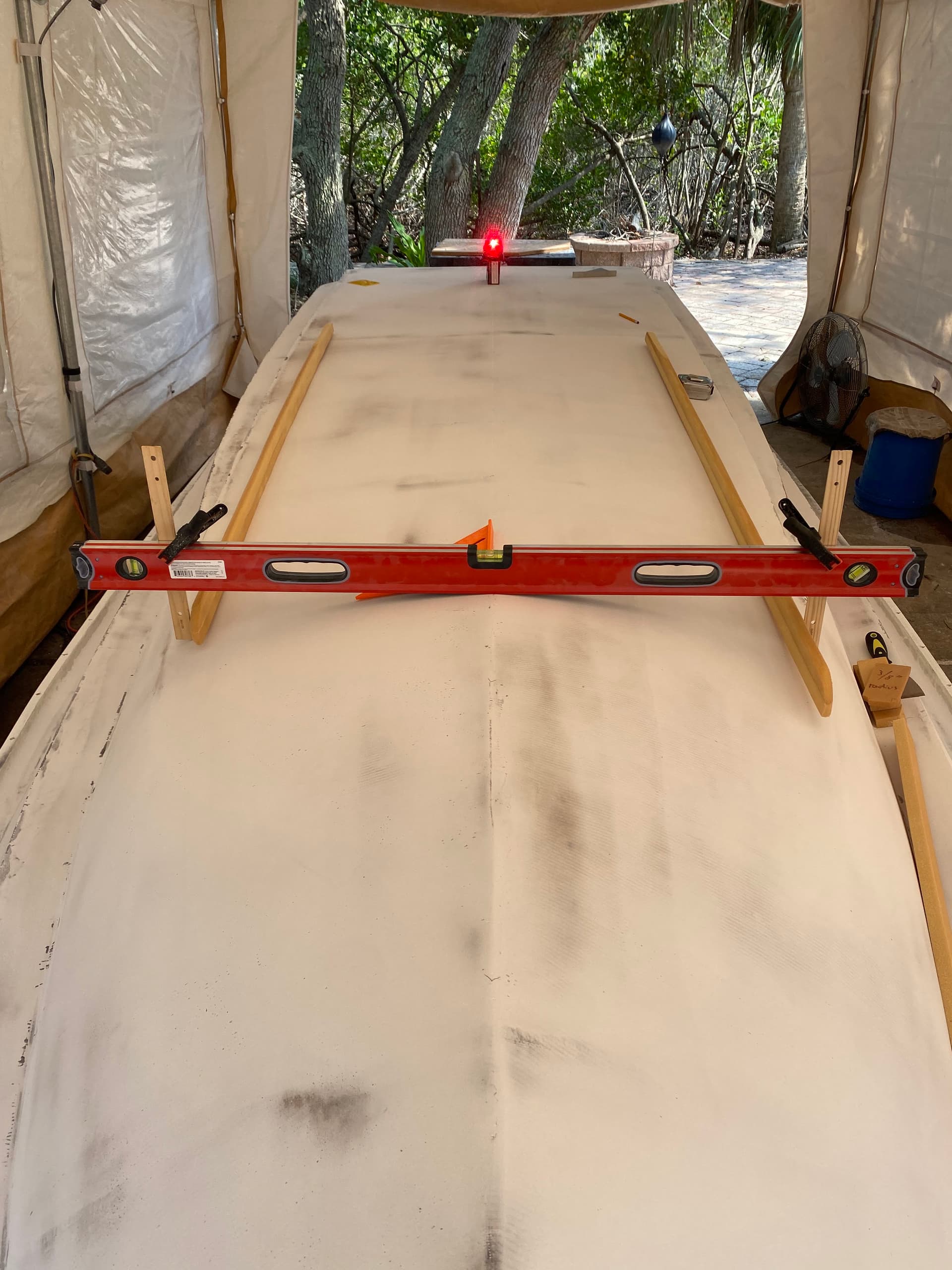 Core glued, screwed, lighly faired, outside corners radiused, screw holes filled with putty, inside corners filleted, core marked for glass (50”).