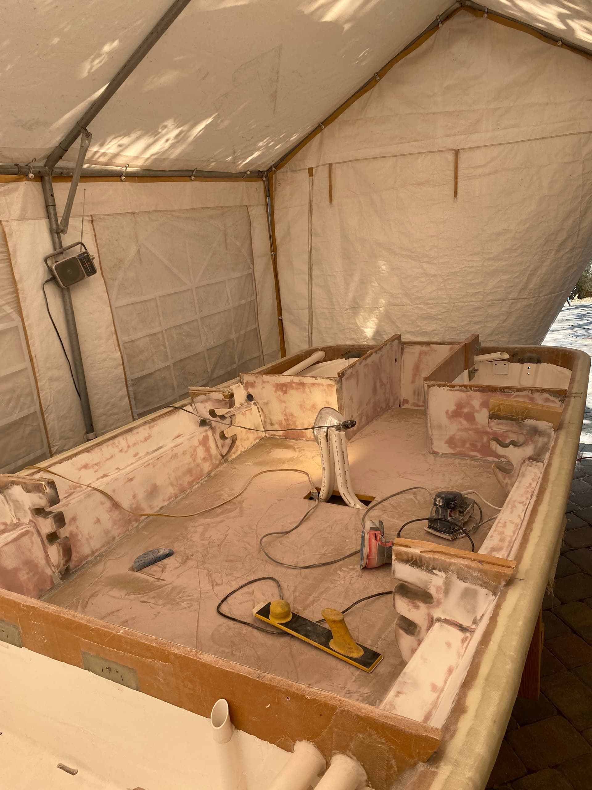 Cockpit is faired and ready for primer. Glass blocks 1/2” thick installed for cooler tie down, in front bulkhead to bolt fuel tank and rear port hatch to bolt a fuel water separator.