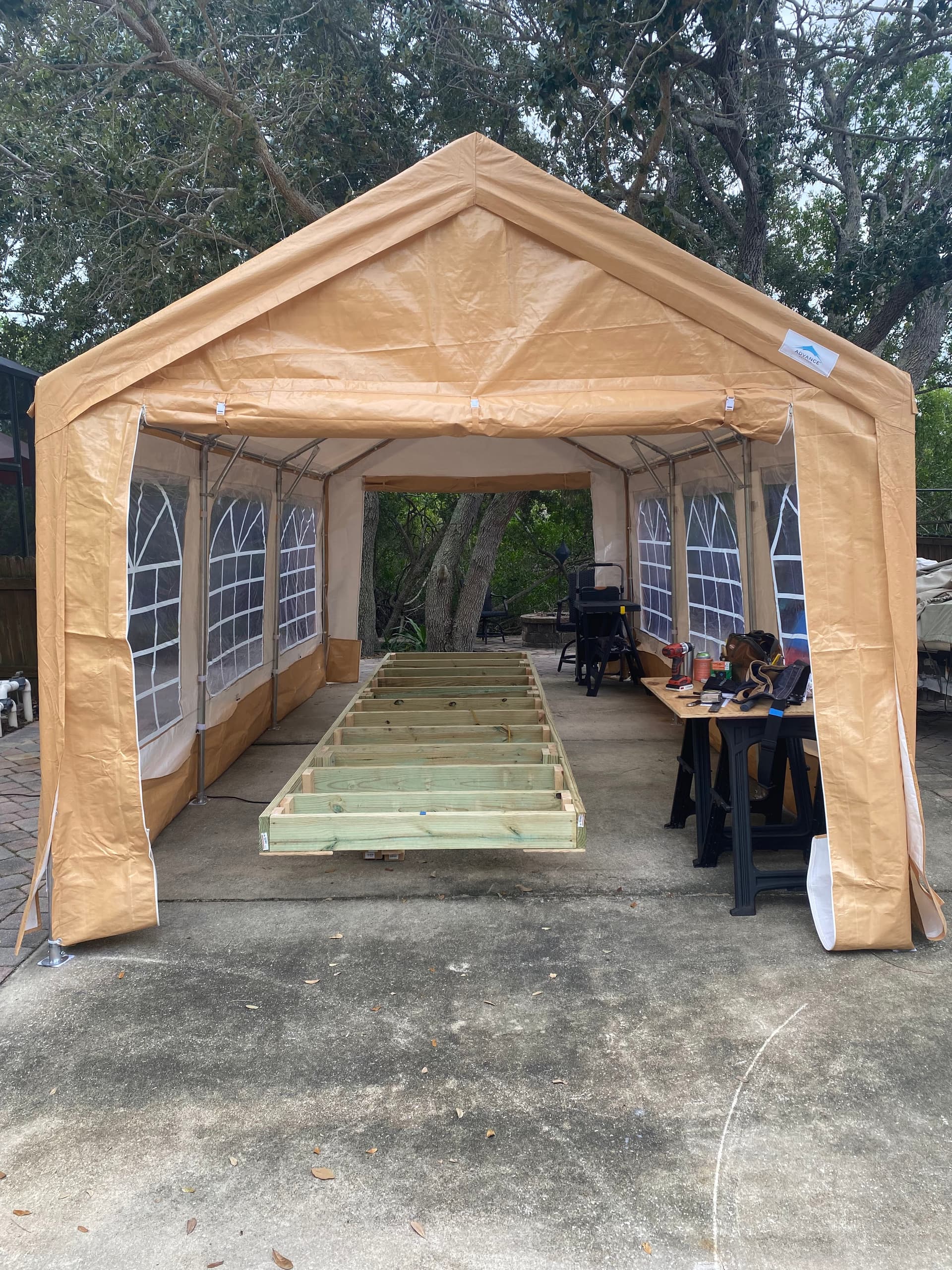 The tent canopy is 10’x20’ from Amazon and has worked out well. Strong back complete. Wheels from HF screwed to bottom make it easy to move around.