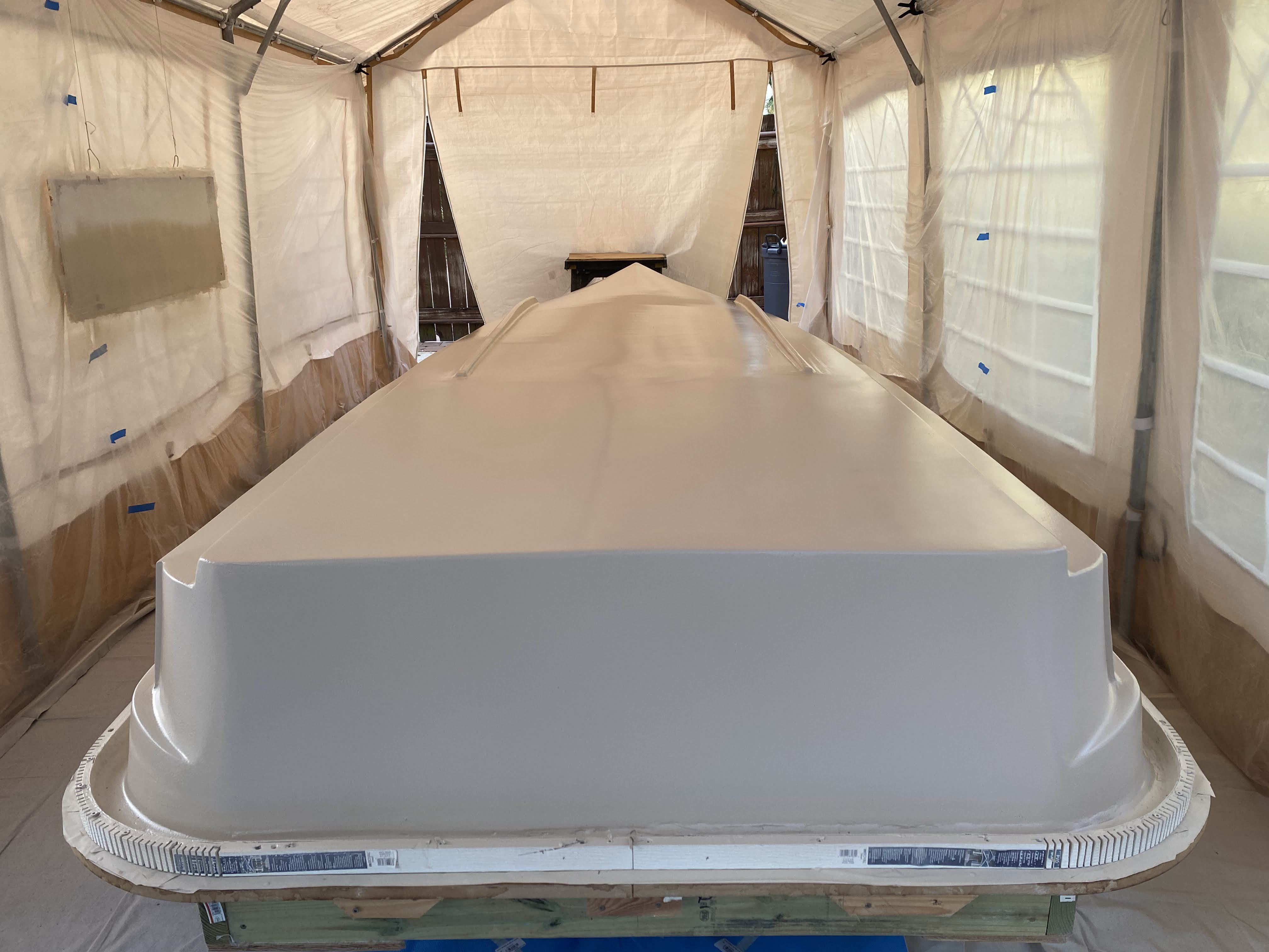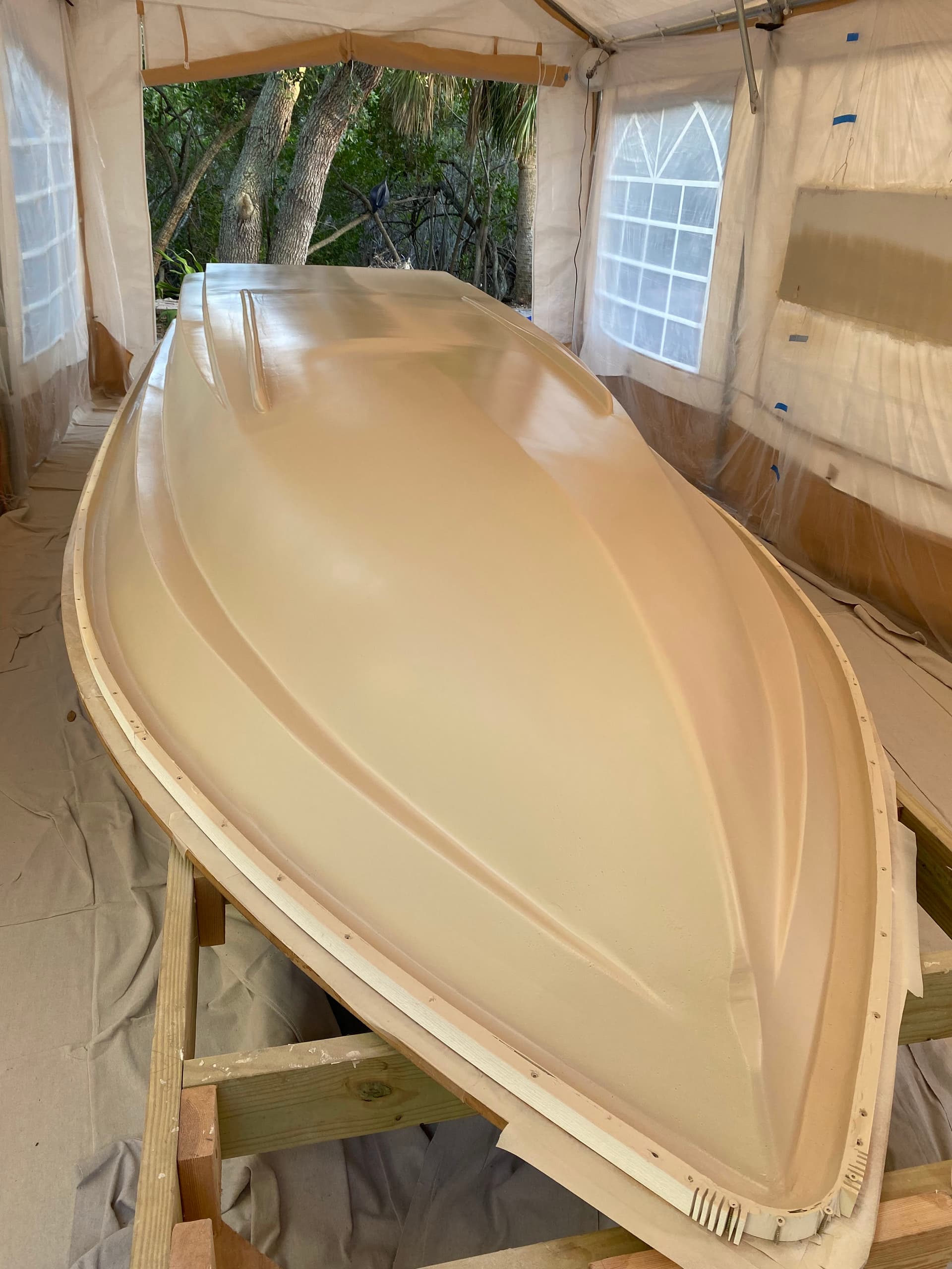 Hull flipped, removed foam in bow and where trim tabs are screwed. These areas are built up with many layers of 10 oz glass.