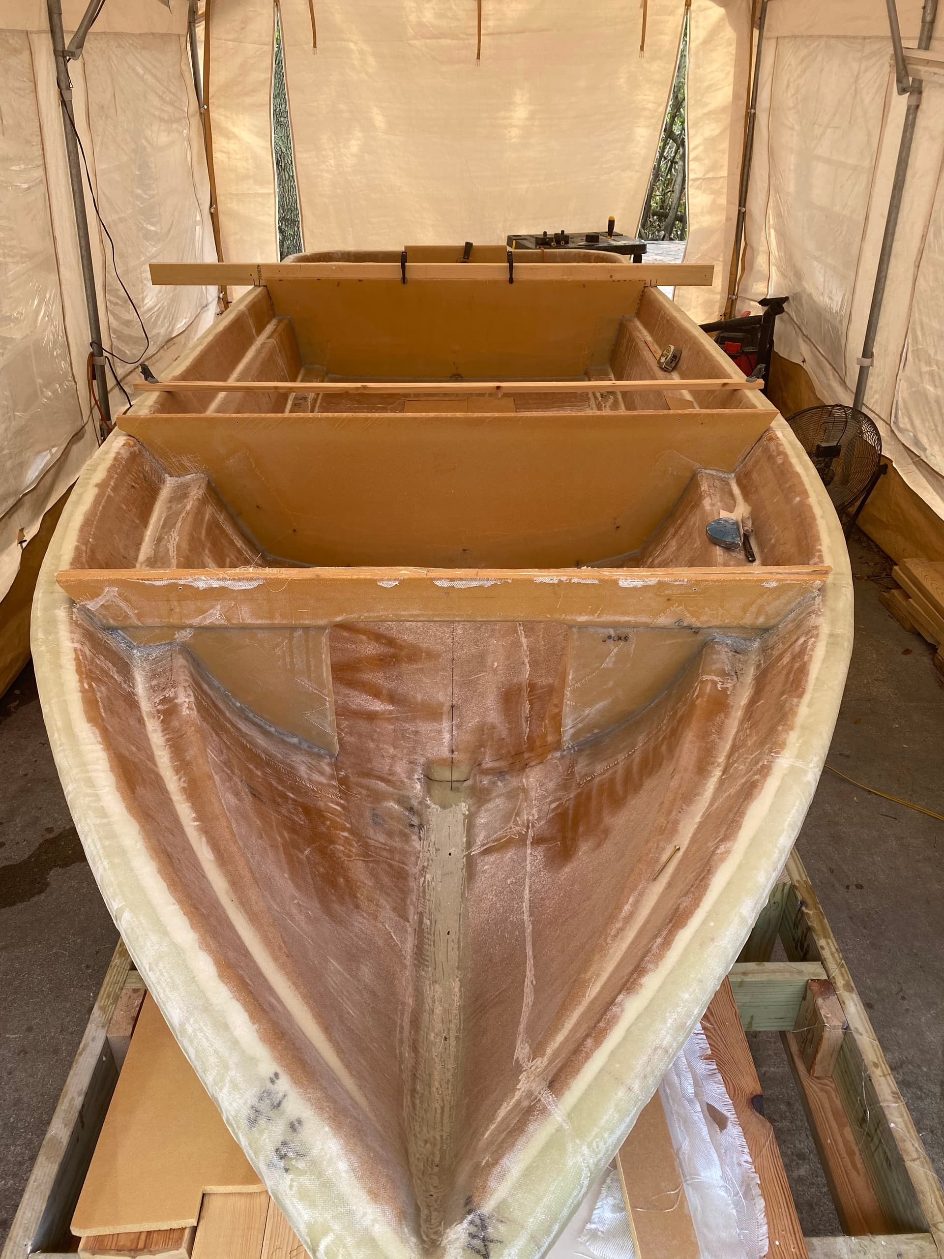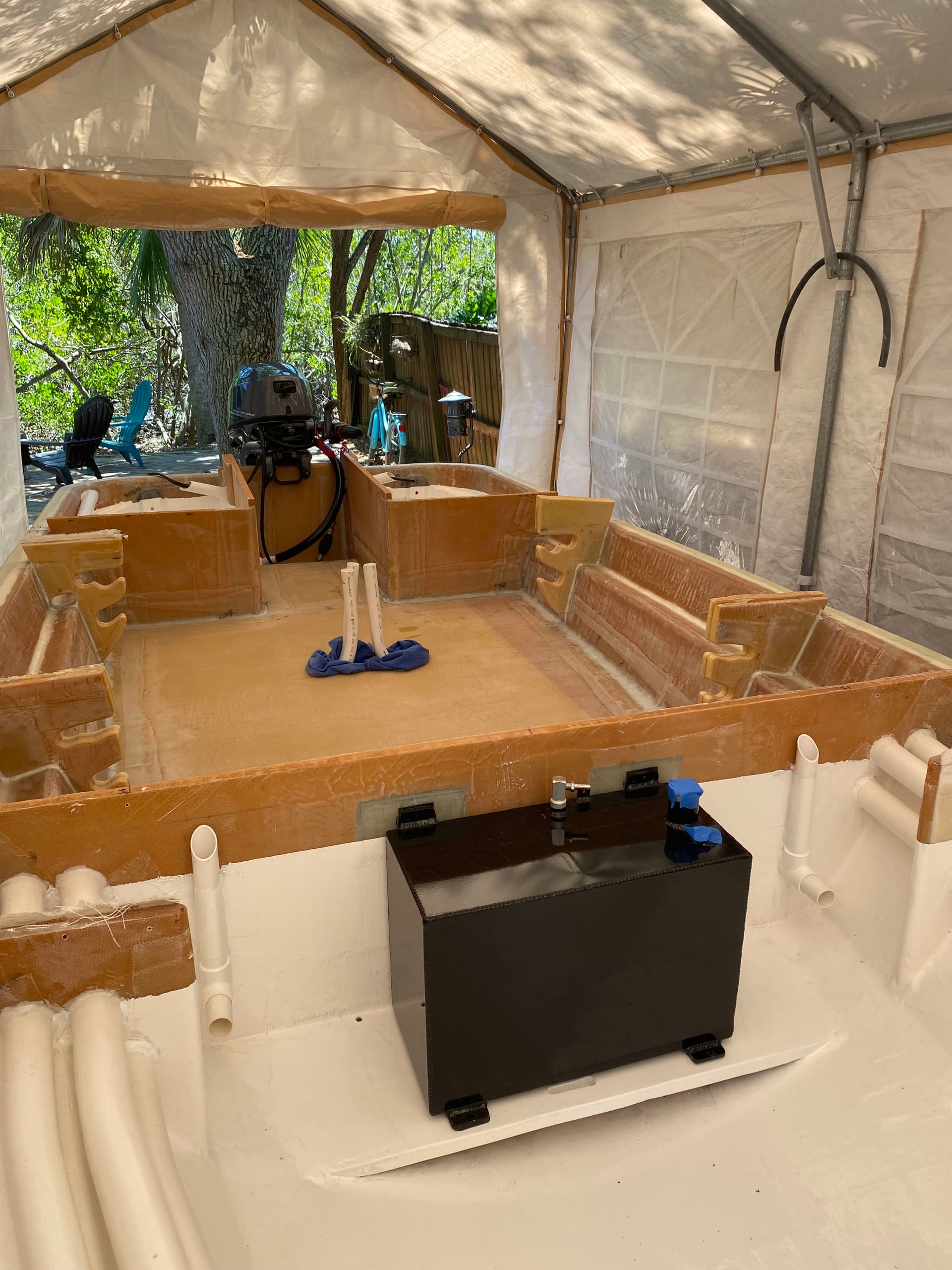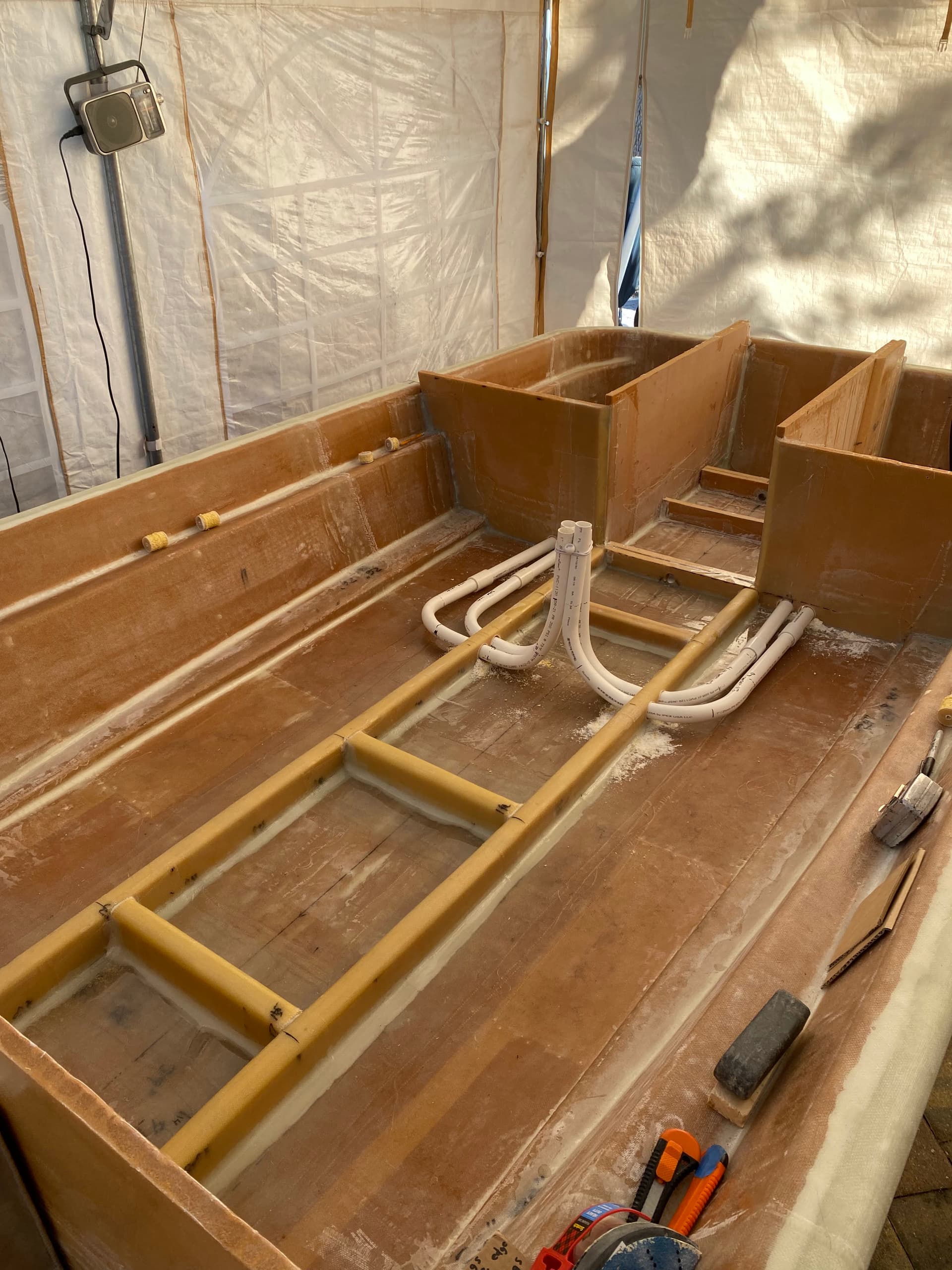 Rear boxes built, stringers glassed and four 1” rigging tubes run to where a small console will go.