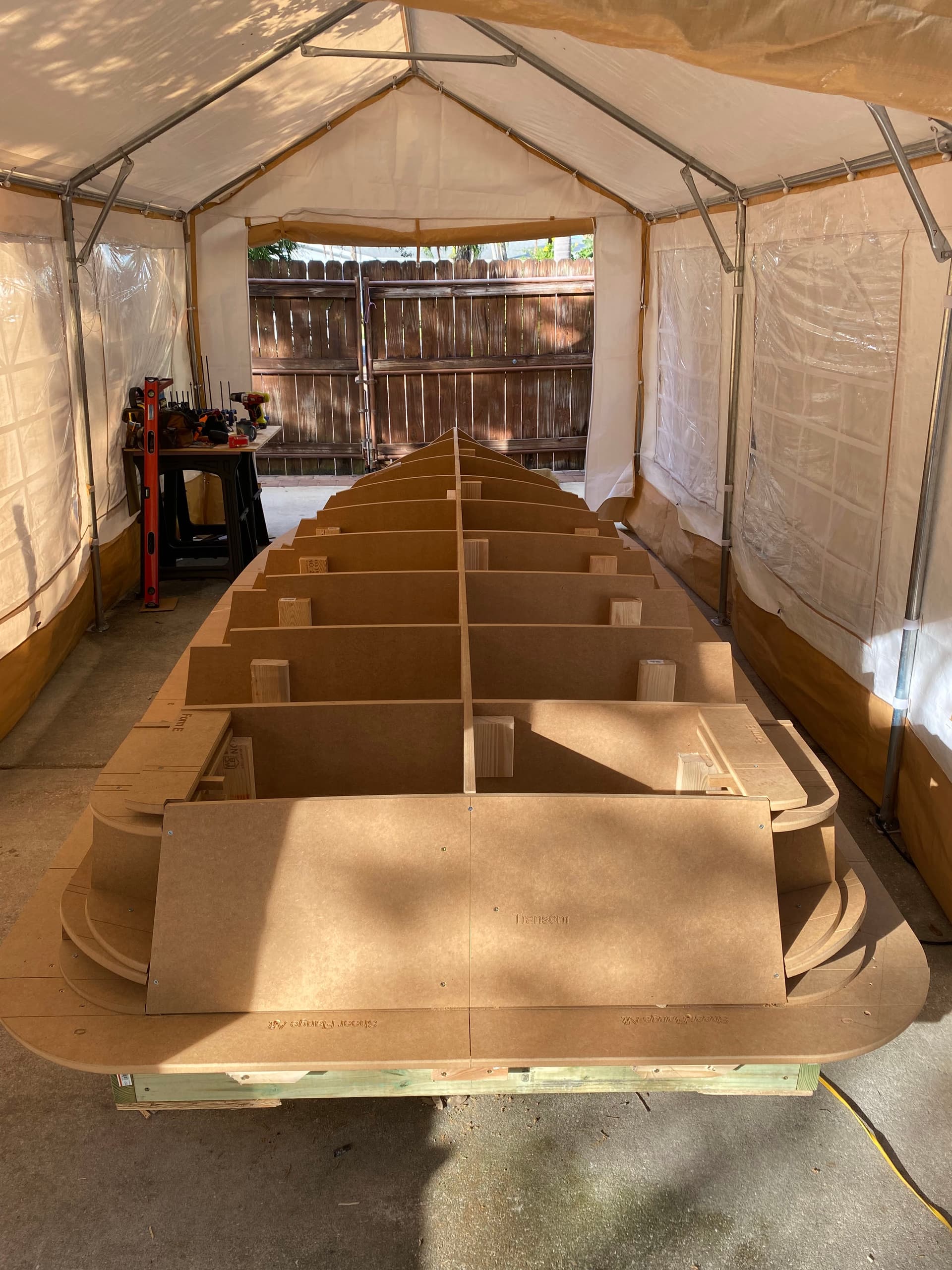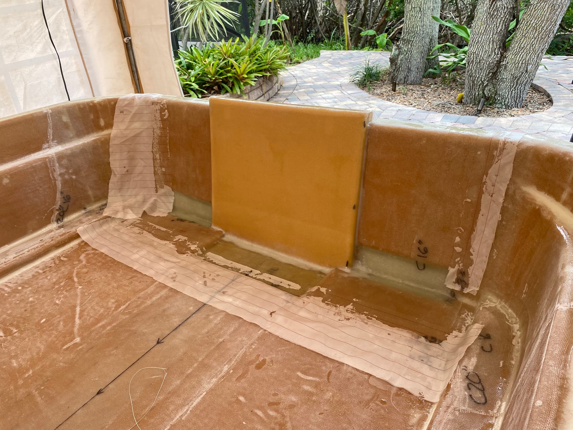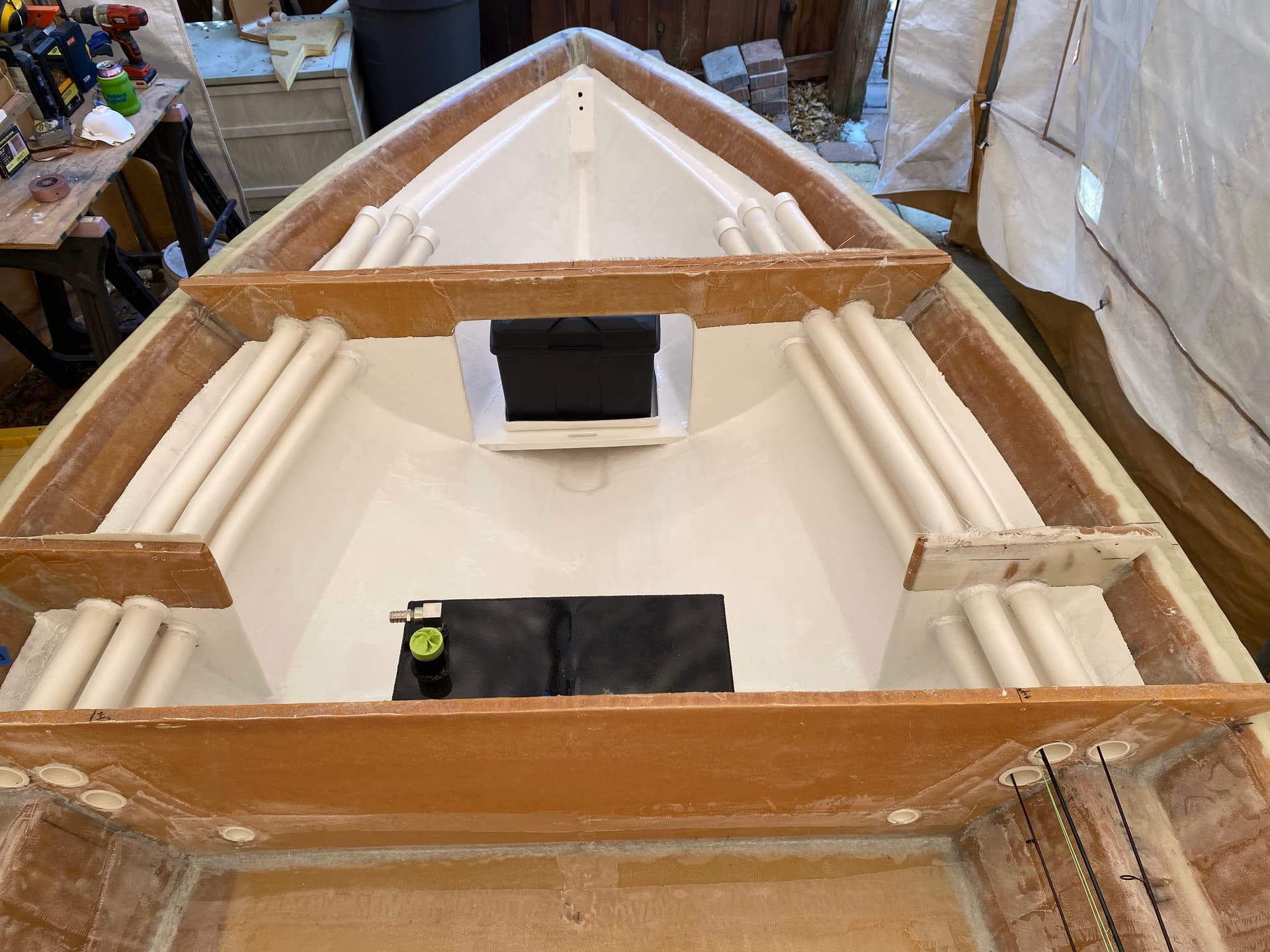 Rear boxes built, stringers glassed and four 1” rigging tubes run to where a small console will go.