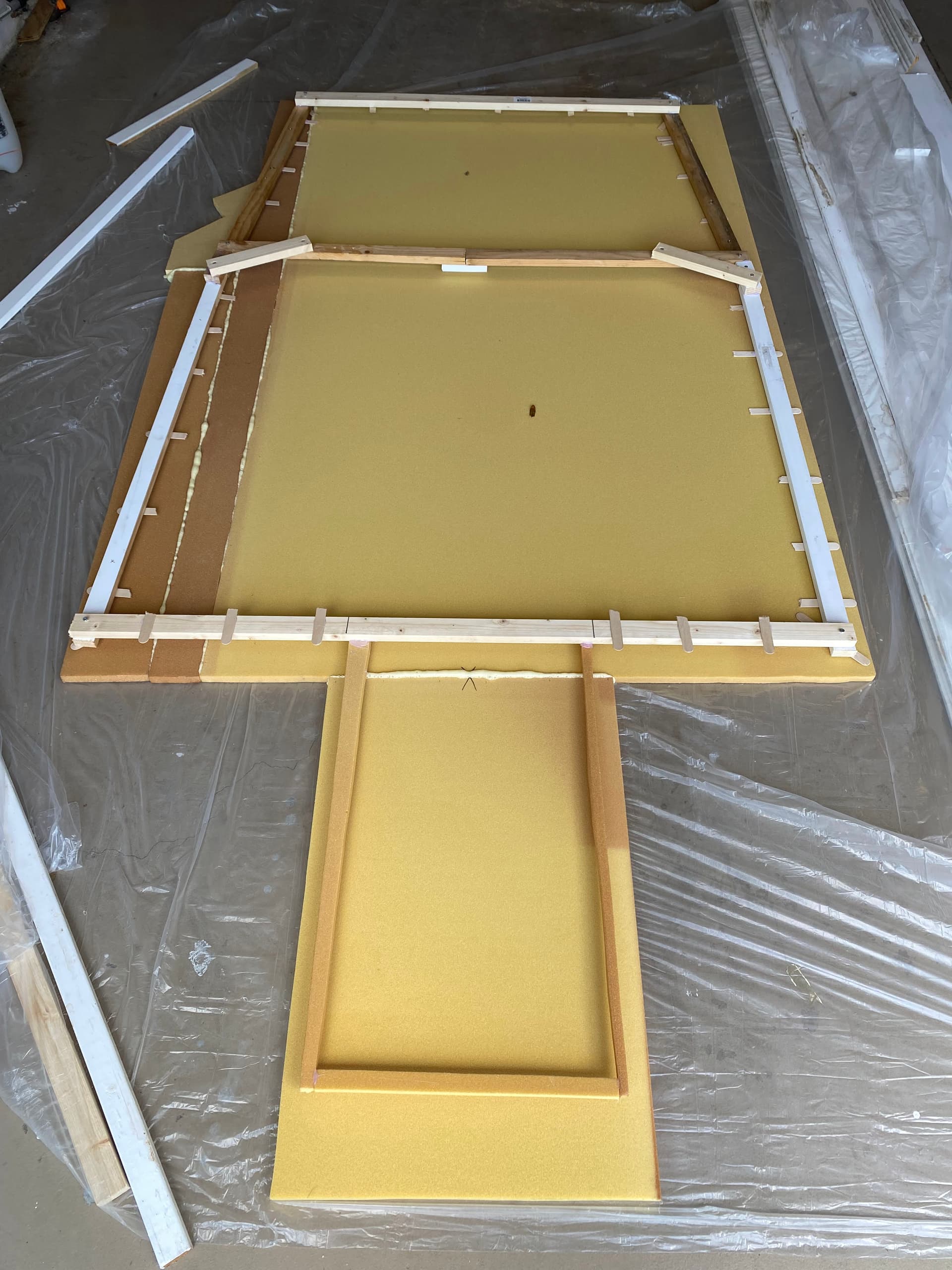 Sheer flange taped over with packing tape, sheer return kerf cut and screwed down. Starting to glue foam with original Gorrilia Glue (brown stuff).