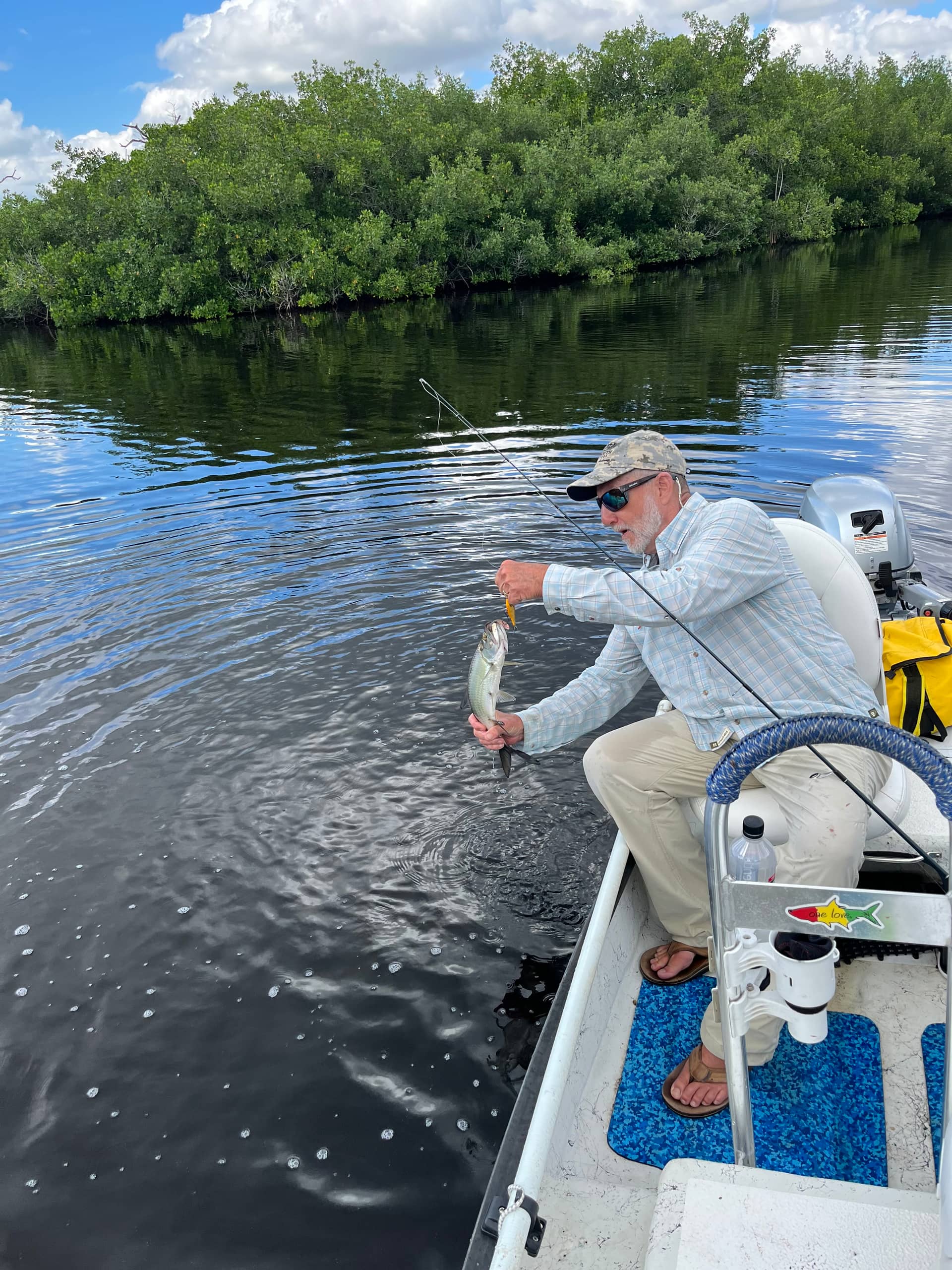Been too long, but finally got my good friend Shannon back down to the Glades to do some backcountry fishing, this time in the Gheenoe. Made it easy by launching out of the Rod & Gun Club and then running straight out the Barron River to access the areas we wanted to fish. Wind was not favorable (N/NW), water was churned up, and the tides were week in between moon stages but we made the most of it. I had a pretty good day on Wednesday with a number of small snook and juvenile tarpon. For some reason, Shannon had trouble hooking up–lot of short strikes. Tables turned on Thursday in a different area when Shannon got hot on the small snook and mangrove snappers. Nice dinner at Camellia Street Grill on Wednesday night and a good, fun pre-Halloween dinner at the Havana Cafe on Thursday night–complete with costumes and karaoke! Here are a few pic’s from the two days: