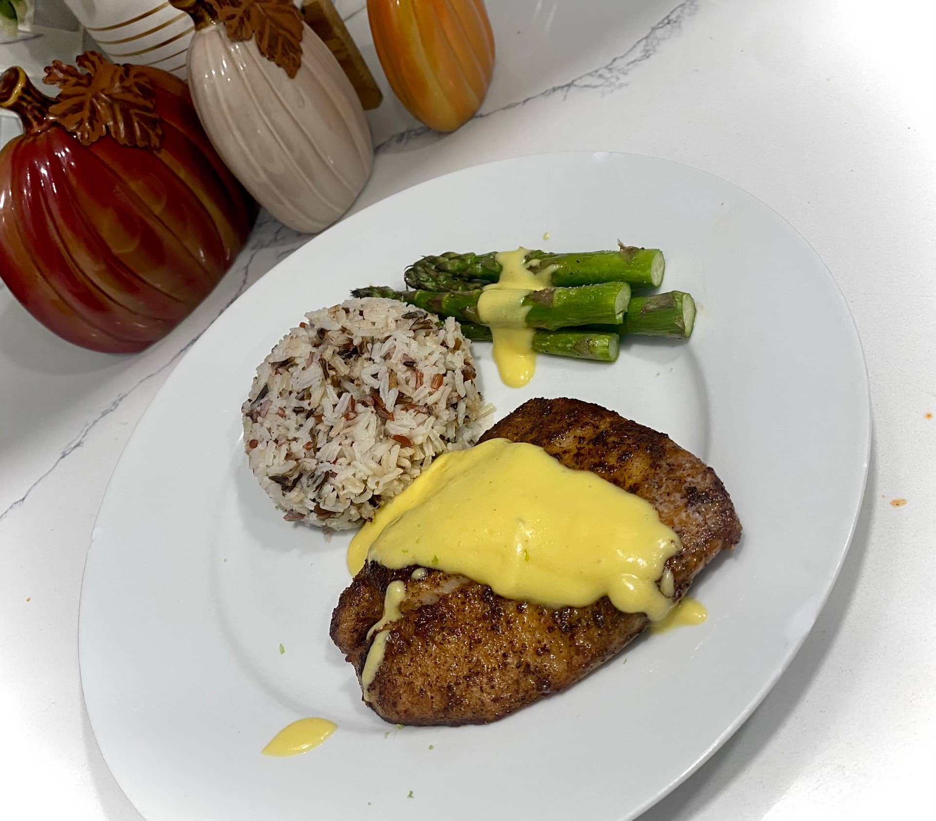 Blackened triple tail with key lime hollandaise, served with wild rice and asparagus…