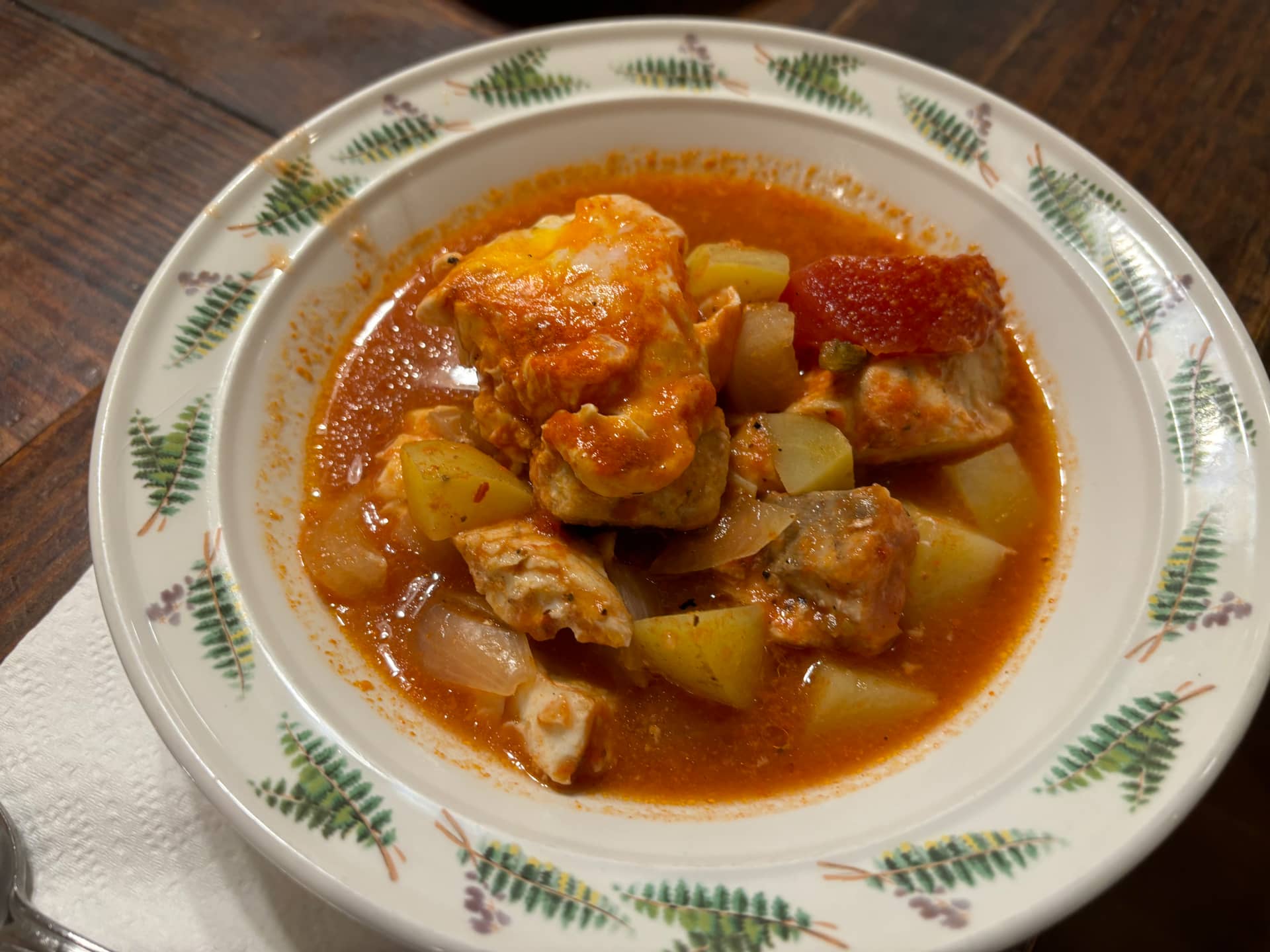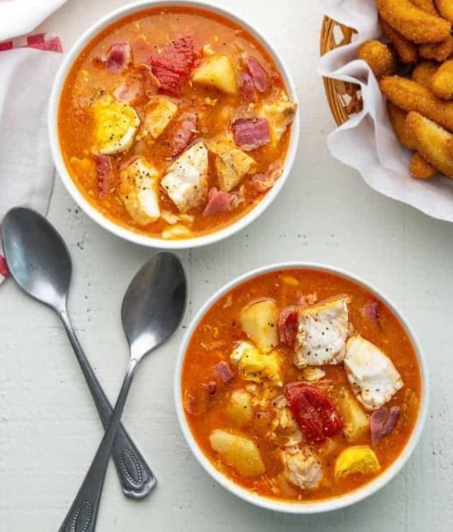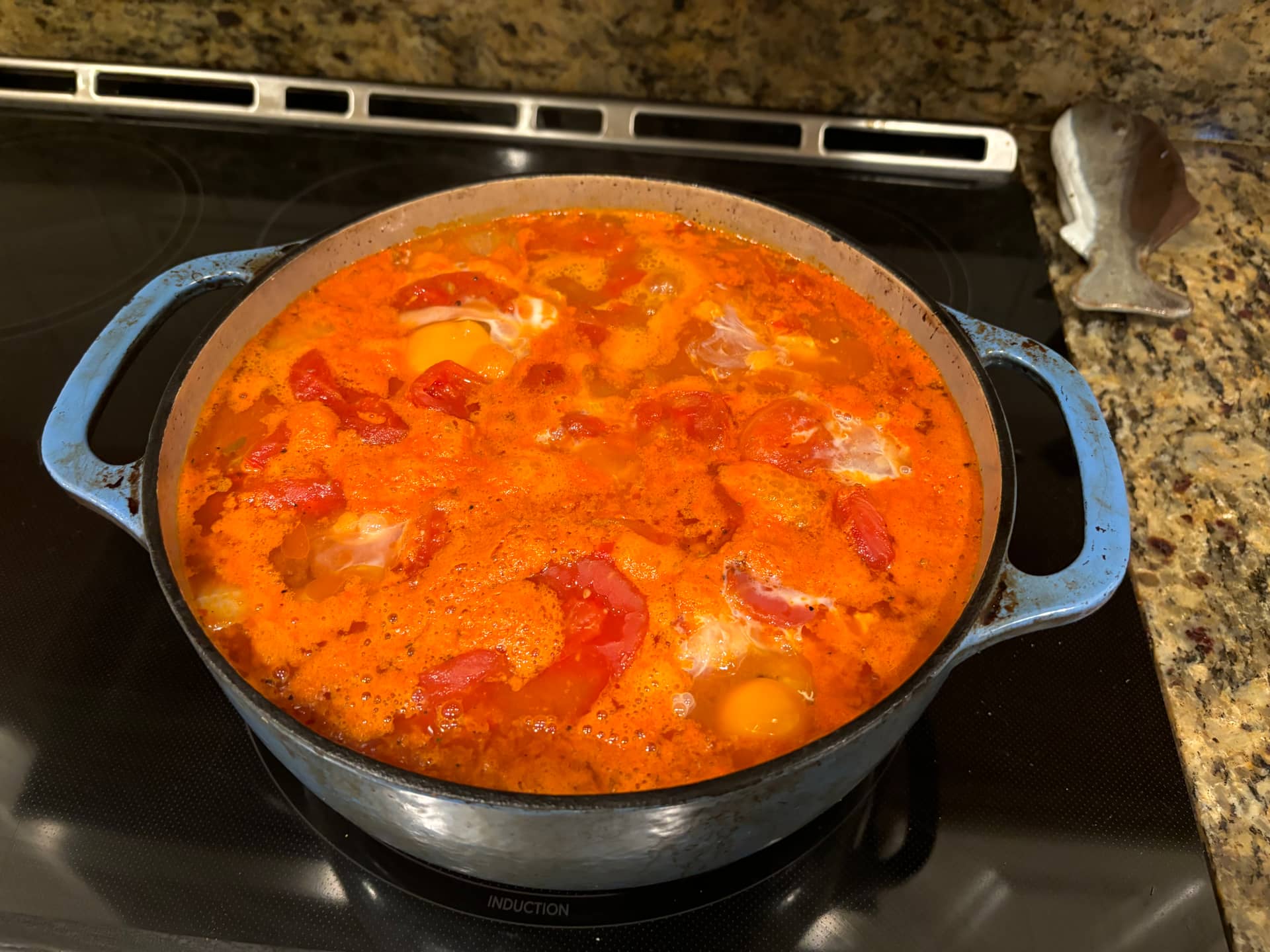 It is called “Rockfish Stew” and usually made with Striper. However, redfish or any non-fragile fish does great. Two pieces of advice: make sure the tomatoes are cut up in relatively small pieces and get high quality applewood bacon! Oh, and the eggs go in last.