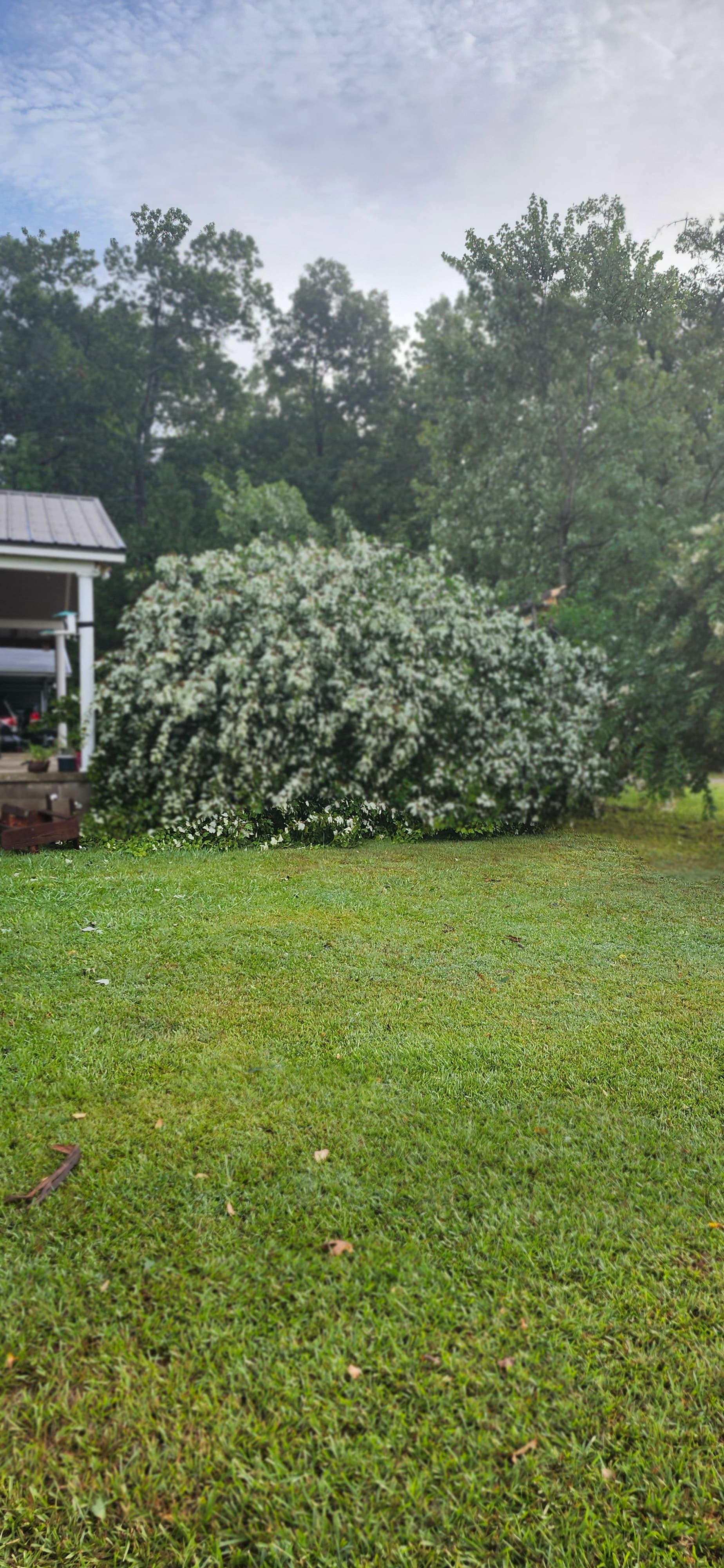 Y’ALL, I have the best neighbors!! About 10:30, my niece’s husband who is part owner of a large chicken farm on the property behind me was headed to the chicken houses to check on things and do a few maintenance obs. Shortly after, my niece calls and says “Scott said to tell you he will be at your house to take care of your downed tree.” About noon, Scott and his partner in the chicken farm show up with saws, dump truck, and trac-ho. So the 3 of us get after it, and by 3:00 this is what they left me with.