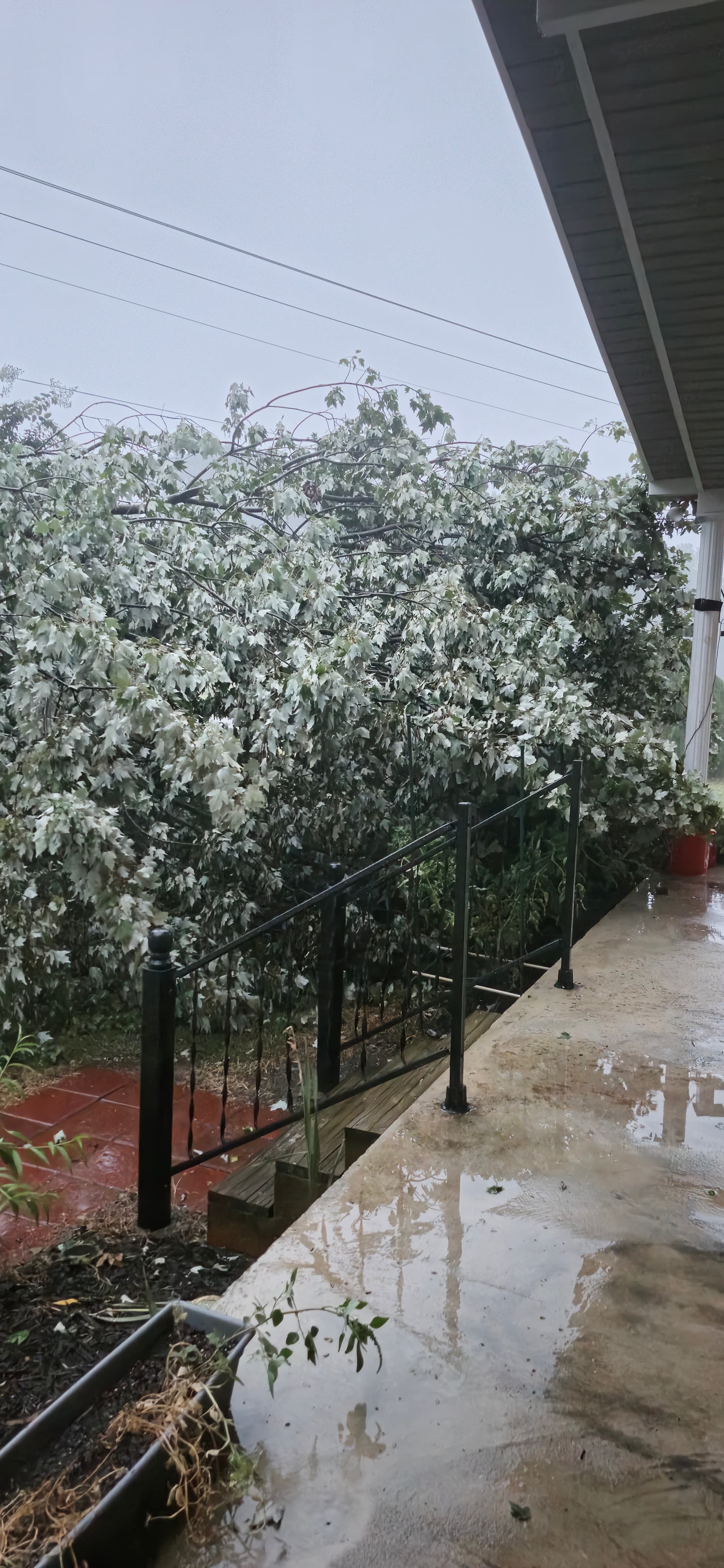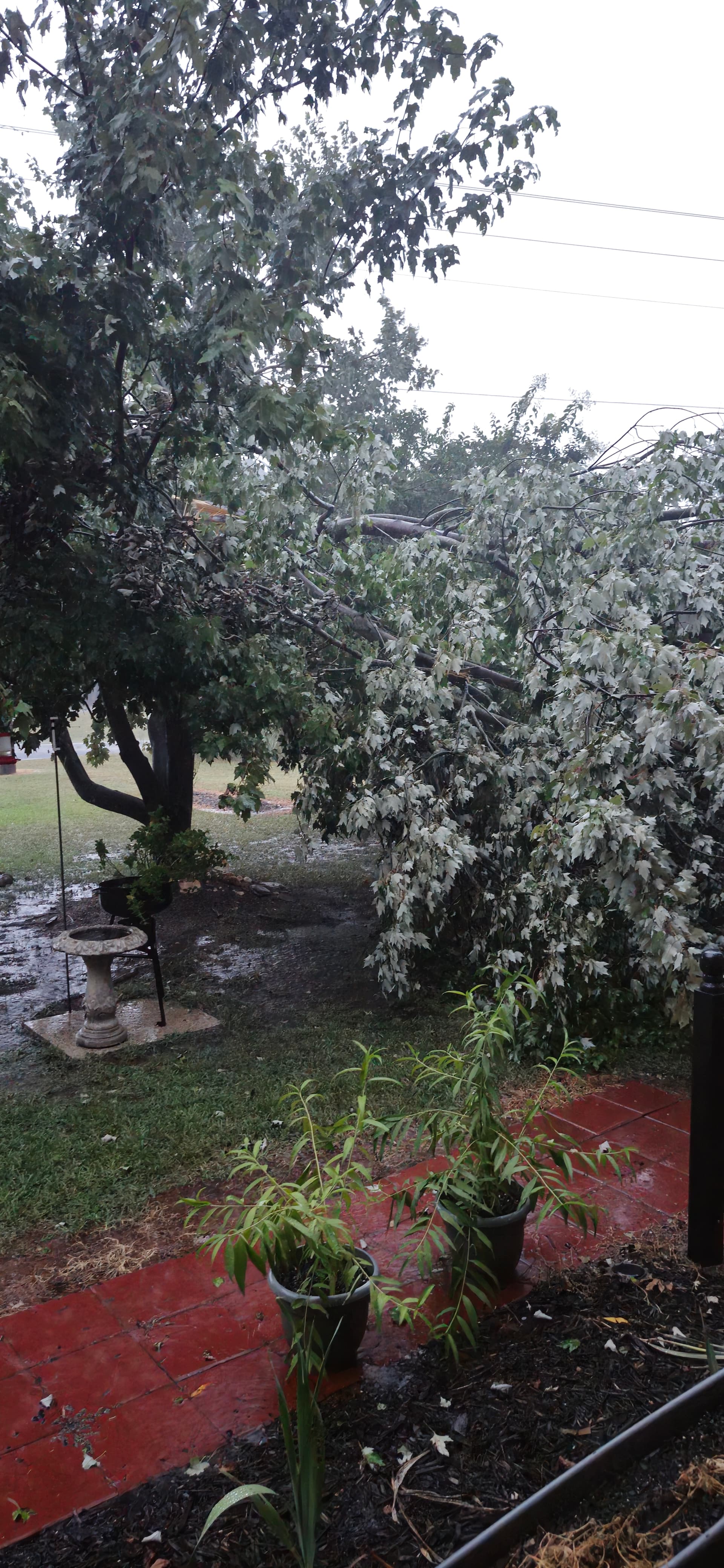Not as bad as I first thought. Middle section broke and fell toward the house. The tips hit the roof but no roof damage. It did take out a bird feeder and concrete bird bath, but mainly just a mess to clean up. It ain’t going nowhere or causing any more damage, I’ll get to it after our cool front this weekend. Temp yesterday was a toasty 101, index about 112-115. High temp Friday in high 70’s. I’ll wait.