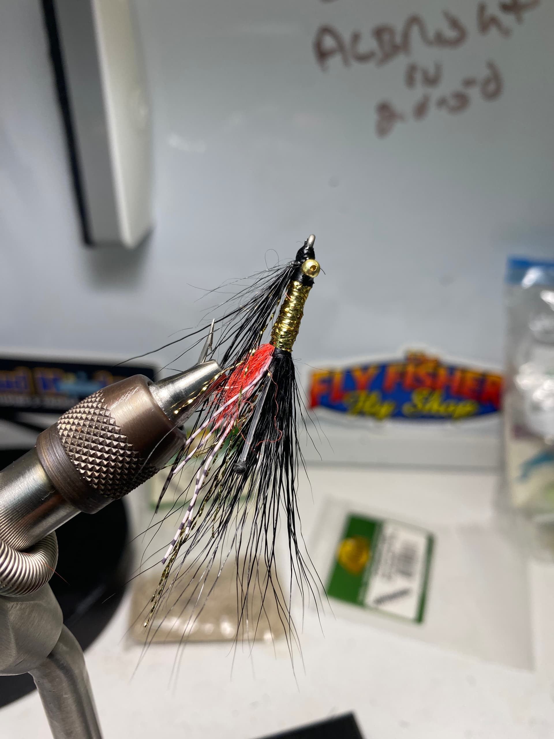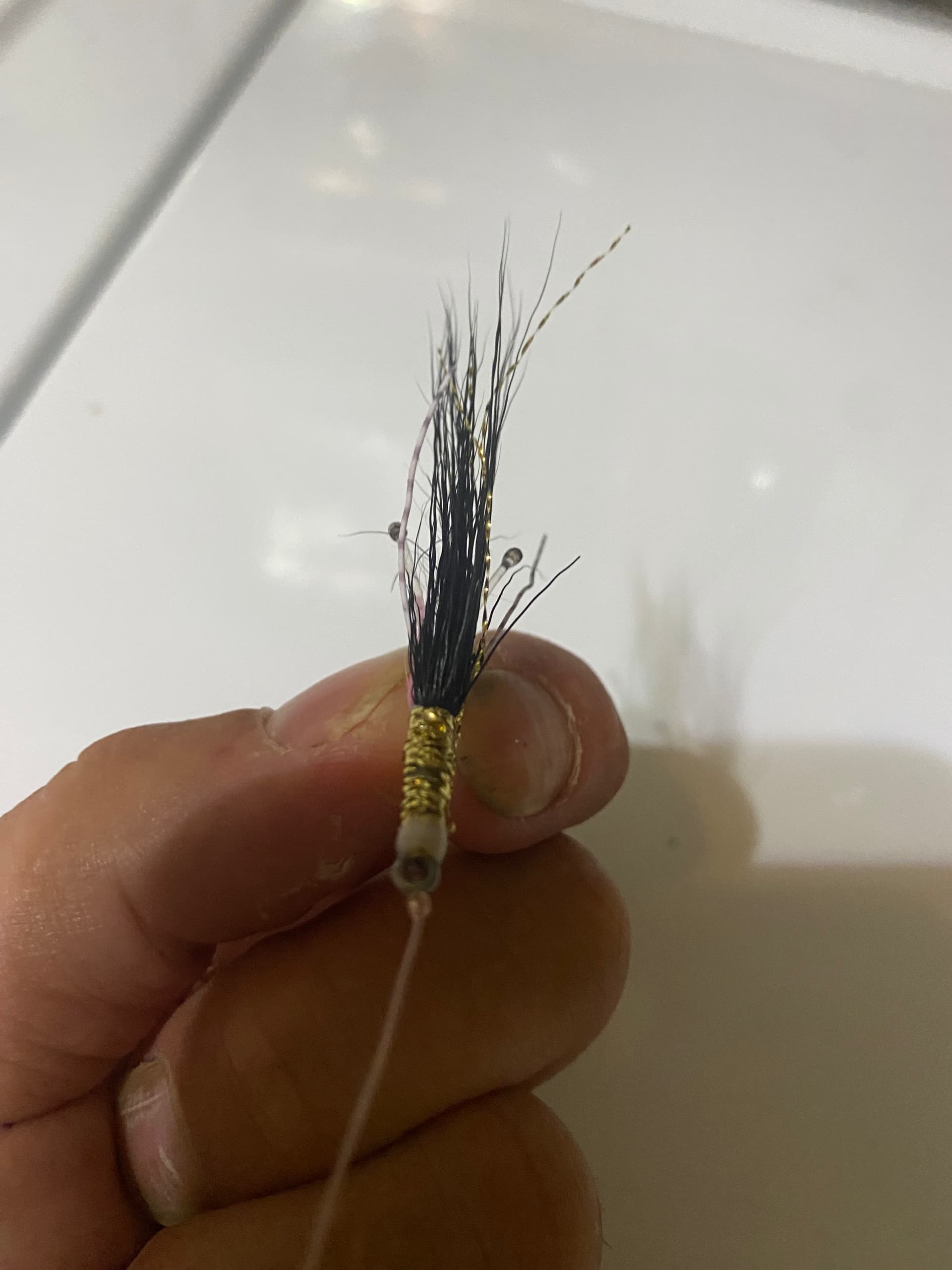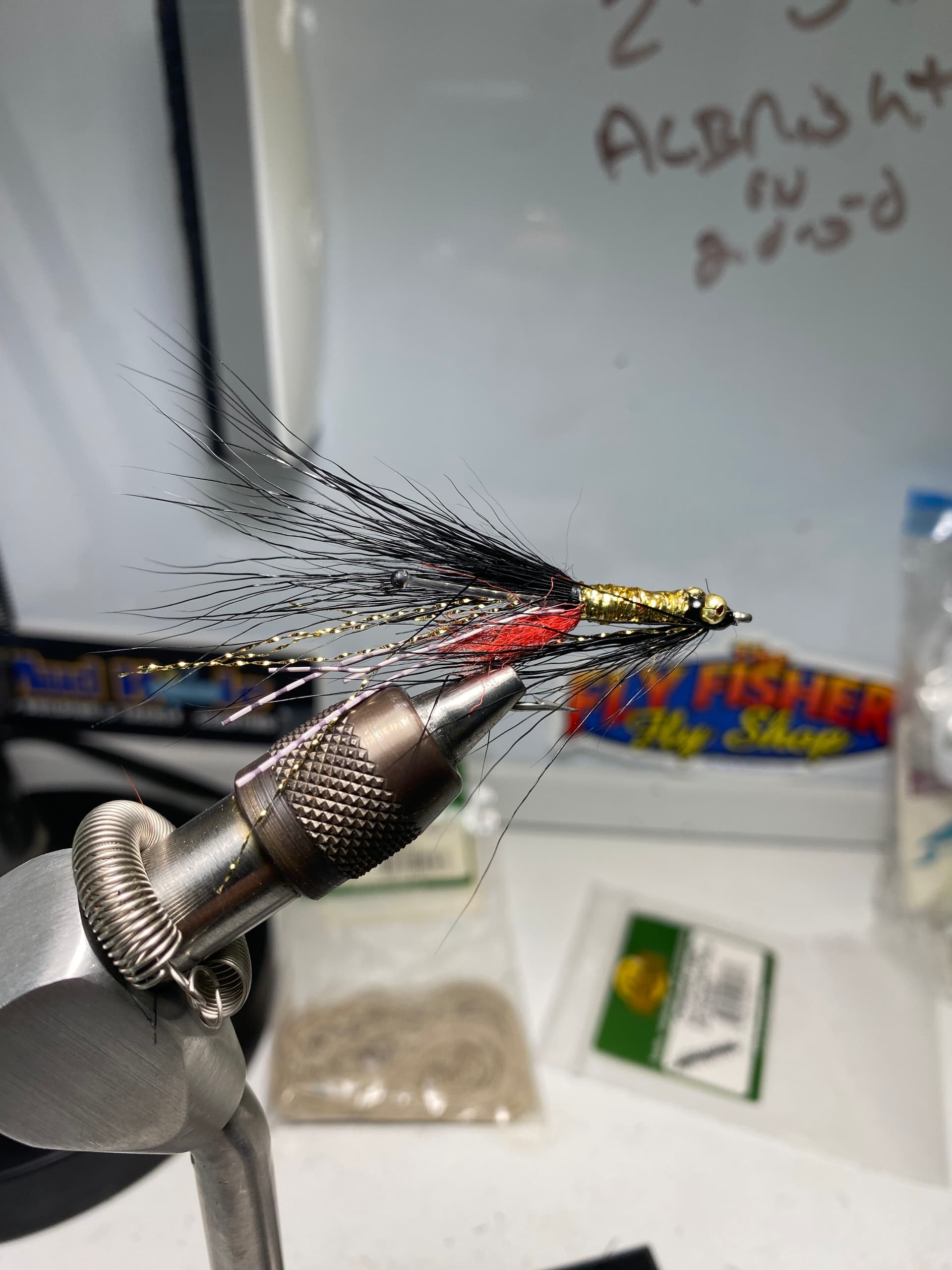 Now onto the fly. The last 3 trips, these Reds have been being bitc$$. I’ve had follows, slurps, snubs but no hookups. I’ve tried different patterns, different colors but just couldn’t get a commitment. So I thought well heck, I’ll try a black and purple 1/2n1/2. So I tied one up for the 8wt. As I’m tying that up, my daughter asks what am I tying for the 6wt. So I tell her, I’m thinking about a small shrimp pattern on either a 2 or 4 hook, and she says, “you outta tie up a Black and Gold shrimp”. (The rod is black and gold for those of you may that may have missed that thread) So I figure, why not. (The 1/2n1/2 had a solid slurp and spit) The black n gold shrimp however, did the trick. Moral of the story.. Think I’ll just stick to throwing whatever she recommends..