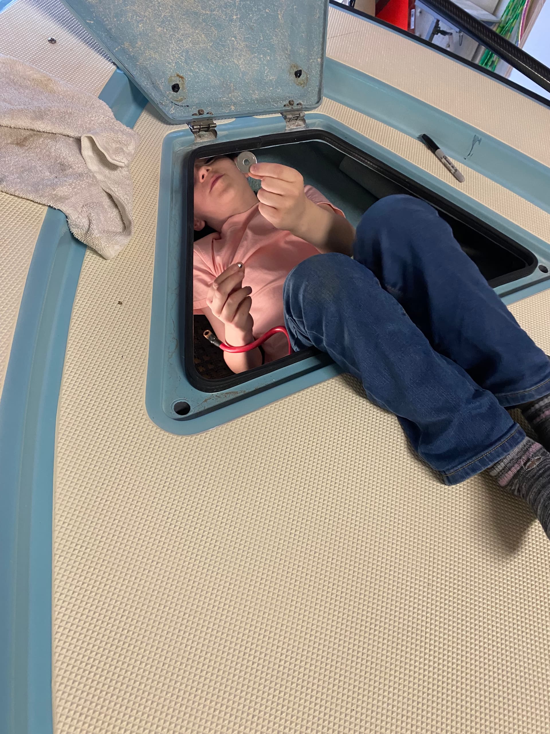 I guess I should do another trolling motor puck mounting write up like I had on the Fight Club. If I have a bow hatch that is hard to work in and nearly impossible to thru bolt due to limited space and fuel tank in the way I use EMT conduit and cut off the open end of a cheapo wrench and smash the EMT on the wrench shaft in a vise. This makes a handle extension so you can get over the fuel tank and get the nuts on to thru bolt instead of other less sound measures. Cut the EMT the length you need to fit in the bow hatch and if you need to cut the EMT in half to fit you can use a EMT coupler with set screws to assemble under the cap to get your length. You need a flash light and a good helper running the impact on the bow. Use blue tape to keep the nut from falling through the box end and Super Glue Gel to hold the nylock nut and fender washer on the wrench so you can work it in position and you can feel the bolt threads catch smoothly as the person running the impact slowly turns the bolt. Don’t cross thread the bolt…You WILL drop nuts and washers so have plenty of extras…good luck retrieving the ones you drop. I learned this from a master rigger in Florida.