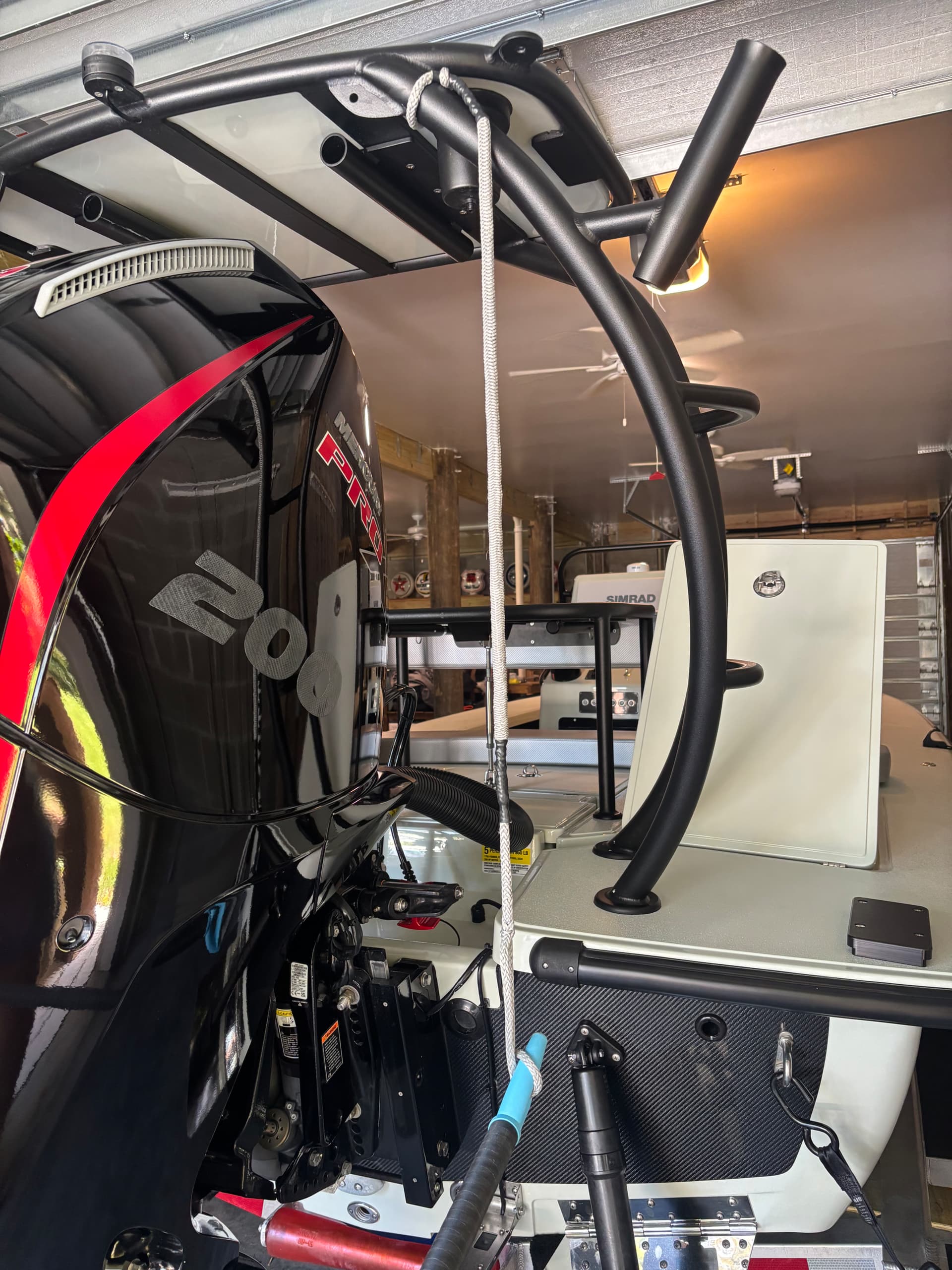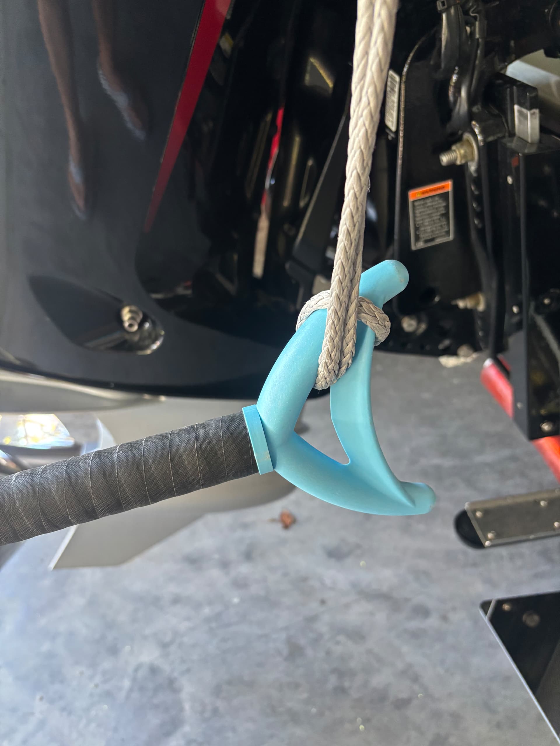 Anyway, I had him do a Monkey’s Fist over a foosball ball. Left about a 3’ leash and tied it to the top of the platform (as long as we could but short enough that if it spun off the platform it would not hang into the prop). You could take this and give it a quick flip and a spin around the pushpole and let friction do its thing. Boat isn’t going anywhere and it was a 3 second maneuver. Worked well for us….and I think it only cost me $30. Child labor aint cheap!