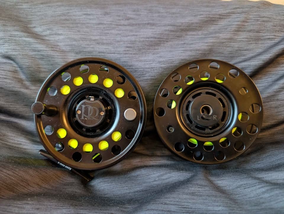 I see no evidence that either of these pieces have ever been fished. No box, and these aren’t the original neoprene reel bags for this model / era, but they fit well. Backing included on both spools.