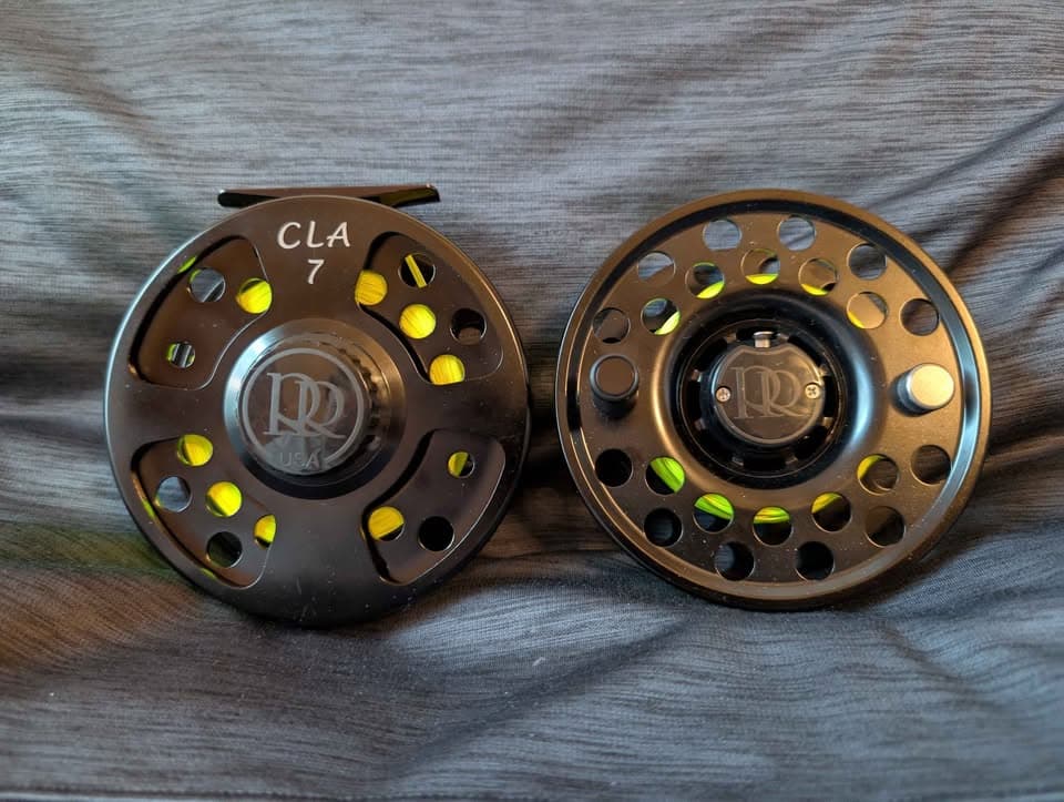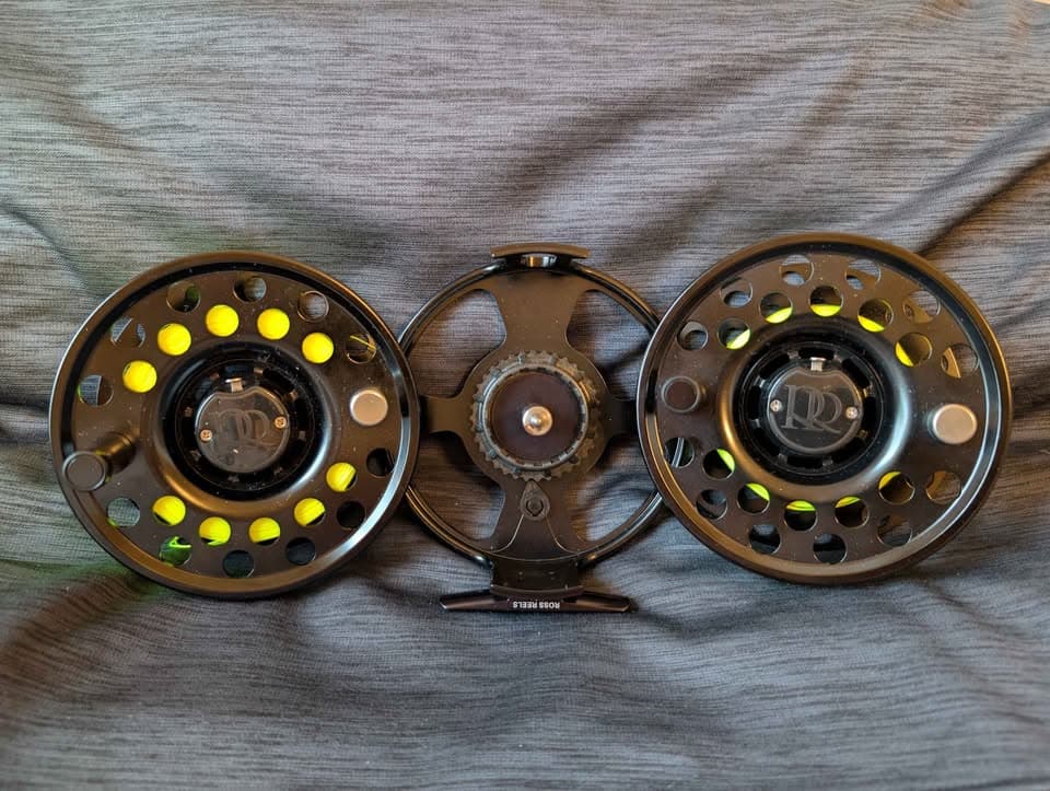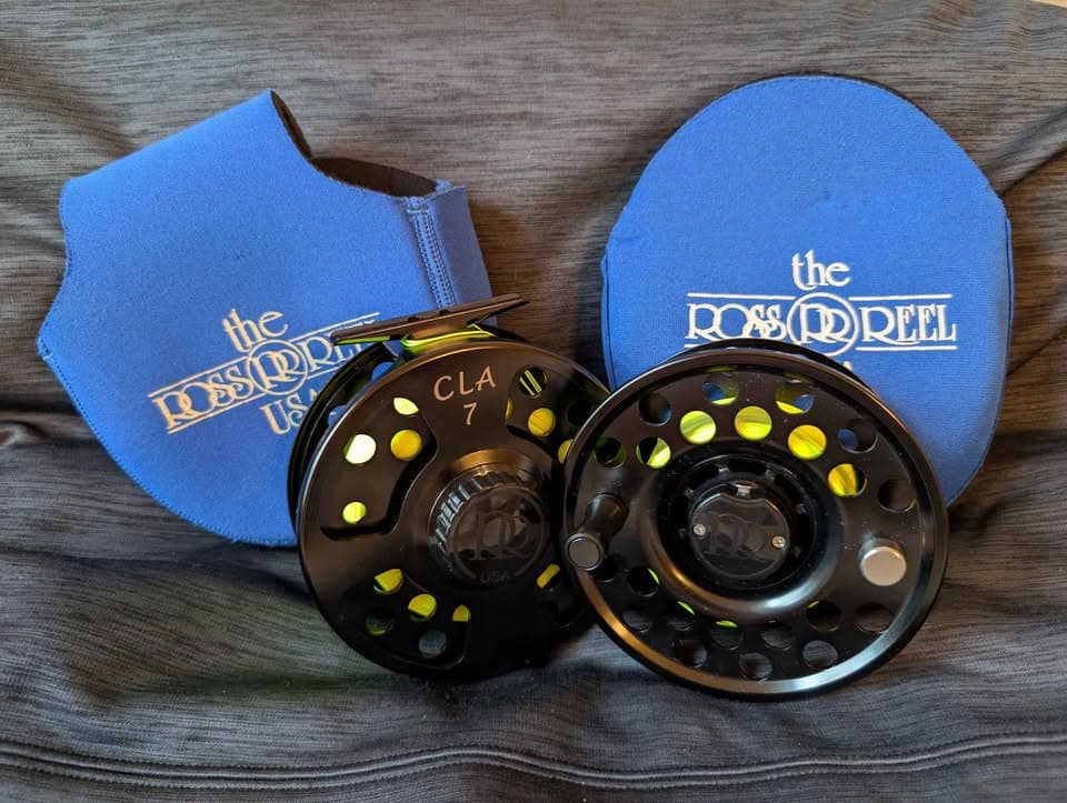This is a US-made fly reel and spare spool from Ross Reels, the CLA 7 model. If I recall correctly, that meant “Cimarron Large Arbor”, and it was discontinued around 2016. The CLA 7 is the largest size they made in that series - it’s listed as 11-13wt, although I’d probably go more 9-11wt with it myself.