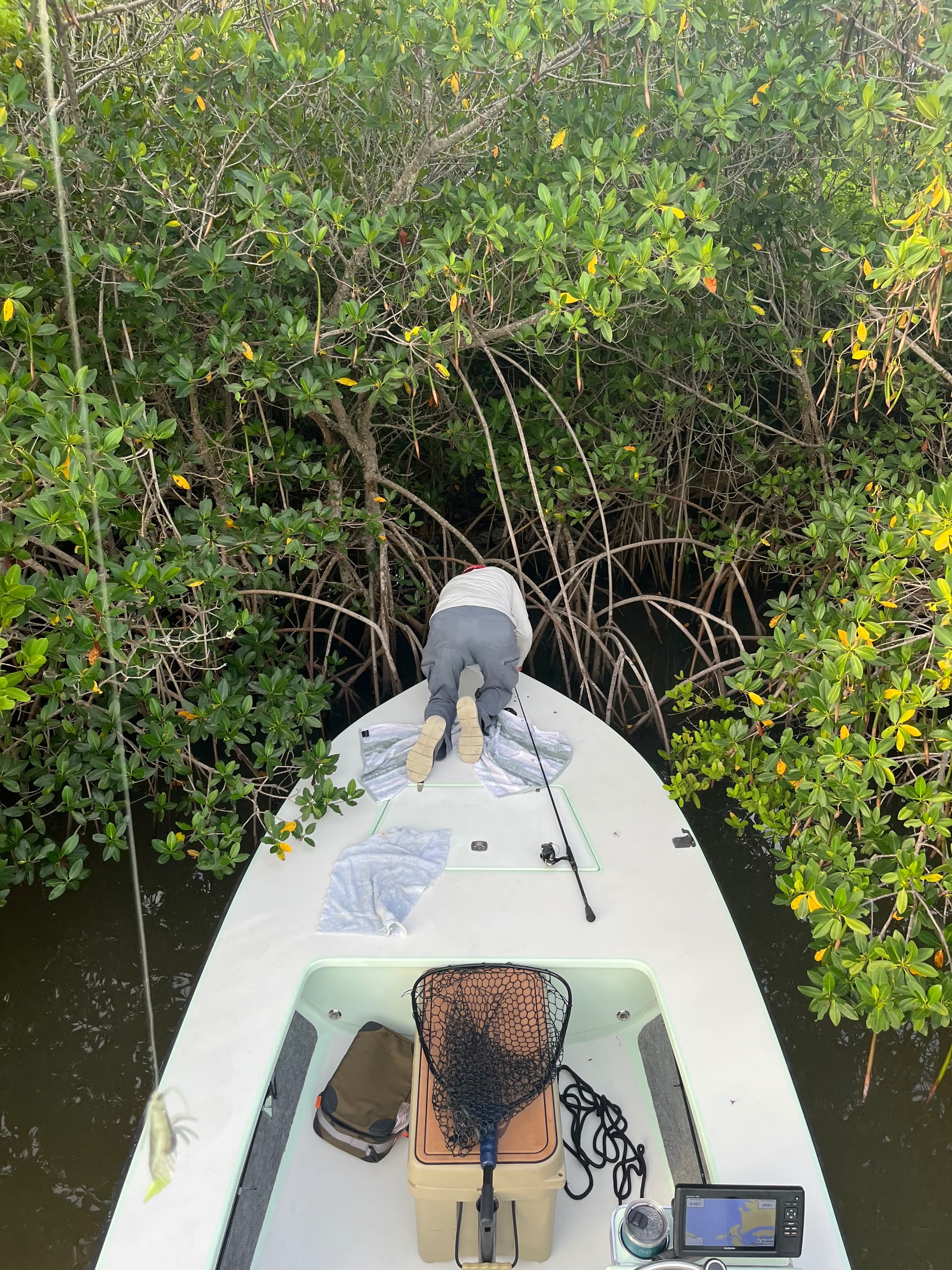 Well Insiders, today I fished with an old friend who recently moved back to Florida after being gone for apprx. 6 years, Insider Shannon McNally was kind enough to have me on the bow of his recently acquired Waterman. I haven’t fished the Banana river in at least 12 years & Shannon wanted to check out some areas he used to fish. Here’s the tally for today; 1 Slot Snook, 1 Slot Redfish, 1 Slot Trout, 2 Juvie Tarpon. That my friends was the RUBBER HOOK GRAND SLAM of the day. The Snook hit, made a run, jumped, ran for the Mangroves & ptooie, popped the 20# leader. The Red hit, made several attempts to get away to no avail UNTIL Shannon says, " I’ve got the net ! " that’s when Ol’ Red hears him, turns it’s head & swims away with nothing but his freedom. Shannon says’ Throw into that little space, there could a Tarpon in there. " One cast, BOOM, Juvie #1 smashs the bait, takes one jump & ptooie, spits it back. Tarpon #2, whacks the lure, spits it out , saying " not today !! "We round a point & doink, I get a head shaker Trout & actually get it to the boat & land it. Going to an area that looked really promising, here comes Flipper & instead of pestering us in the boat, it heads straight to the spot & blows the whole area, nailing a Redfish & that was it for the day. Now here’s the DON’T bring a knife to a gunfight tutorial, I grabbed two rods at the house thinking I had a 20# braid/4000 Fuego for fishing Mangroves & docks & a 6# braid/ 2500 Fuego for Trout. Well, Mr. Magoo here picked up the 8#/ 2500 Fuego by mistake & therefore, had two knives & NO gun. We had a lot of laughs, great fellowship AND…