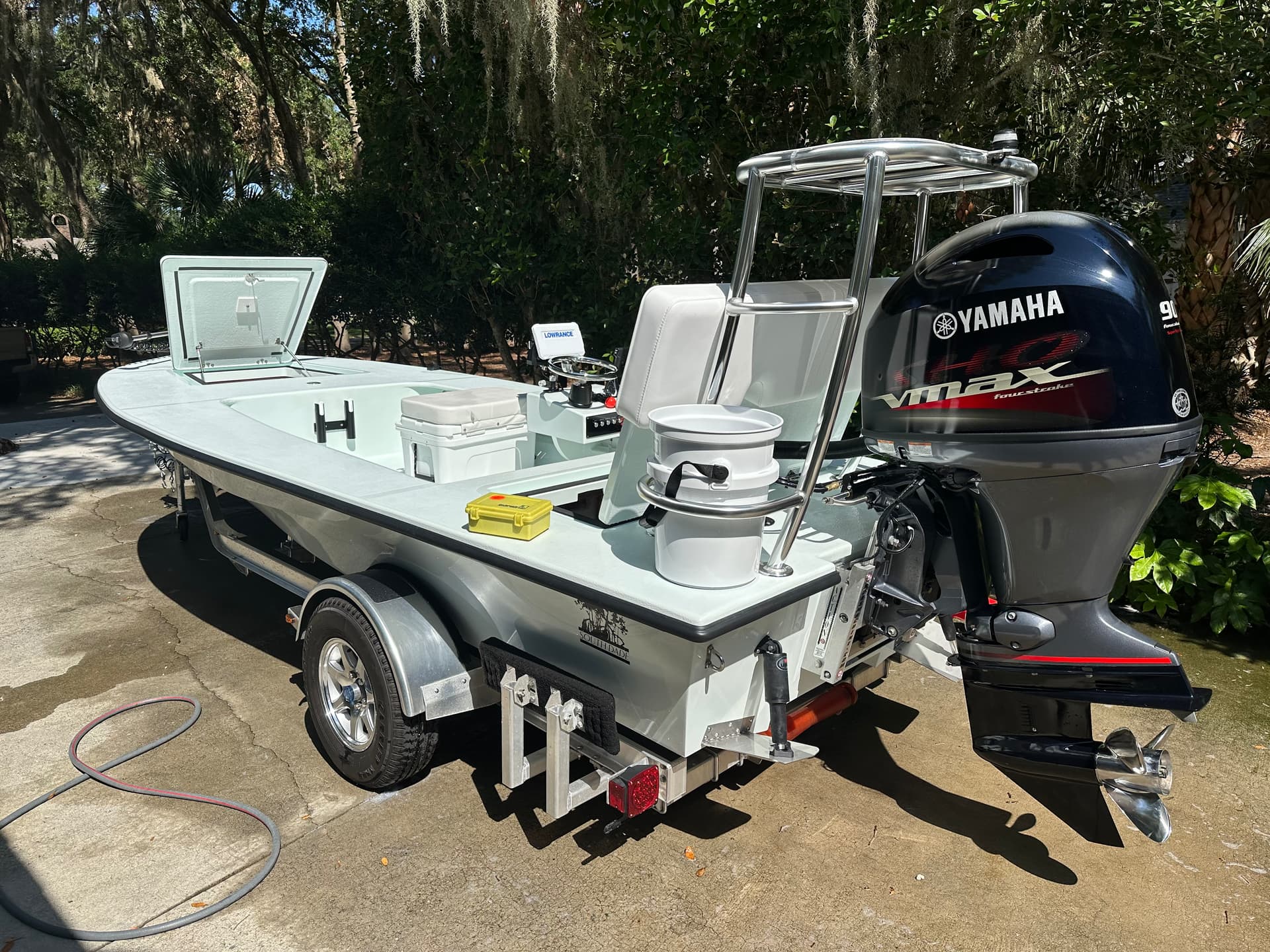 When building this boat with Louis gave me multiple options for engine power, although I’m a diehard Yamaha guy. I went with the Yamaha 90 sho, and I’m very happy with its performance and find it aesthetically pleasing. The mid range torque on this motor is insane and can go from 30 to 45mph really quick. Finding the right prop for this boat was a little bit of a challenge, but I ended up having Baumann propellers do their magic on my power tech PTR three blade. With the stock ptr 3 blade I was getting blow out in sharp turns and when raising the jackpkate. The newest generation of power tech cushion lock hubs is very pleasing, and there is zero clunk or rattle when slowly shifting in and out of gear or at low idle. This skiff can really scoot, but I find myself normally operating around 3700 RPMs and roughly 30 mph.