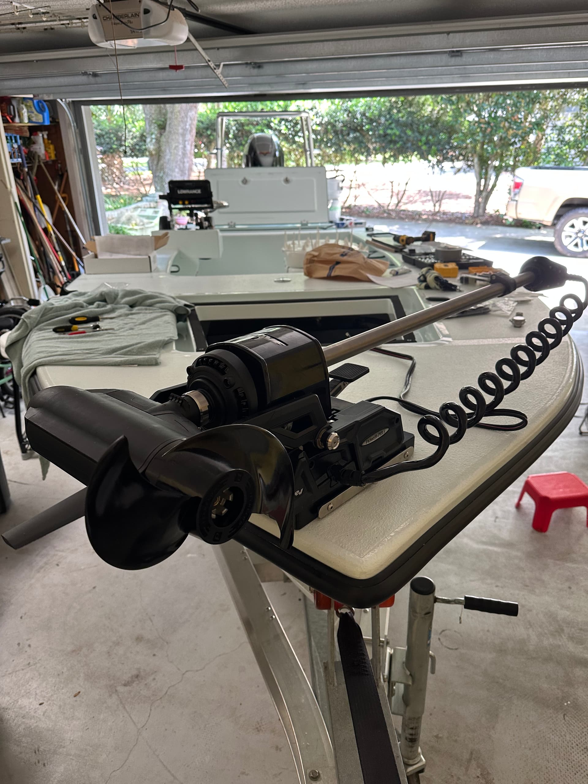 I splurged and got the power pole move pv trolling motor in the 45” variant. The forward deck of this boat was thoughtfully constructed and reinforced with coosa board, and mounting the trolling motor puck was very satisfying because I could comfortable fit inside the forward hatch, and I could really crank down on the installation hardware without worry. I chose the standard mounting position mainly due to the location of the coosa, but I also wanted to keep the skiff as balanced as possible. The front deck of this boat is so large and very beamy so the trolling motor heads sits completely inside the rub rail with zero overhang. The 45 inch length is perfect for this boat even with its extra free board. To power the power pole move I purchase a li time 36v 50ah Bluetooth group 31 battery. I mounted the battery in the aft hatch port side right behind the house battery. This helped balance out the weight of the side console and as well the weight of the trolling motor forward. The power pole move is pretty heavy. I believe it weighs 45 pounds. Everything they say about the move is true: it’s quiet, powerful and efficient.