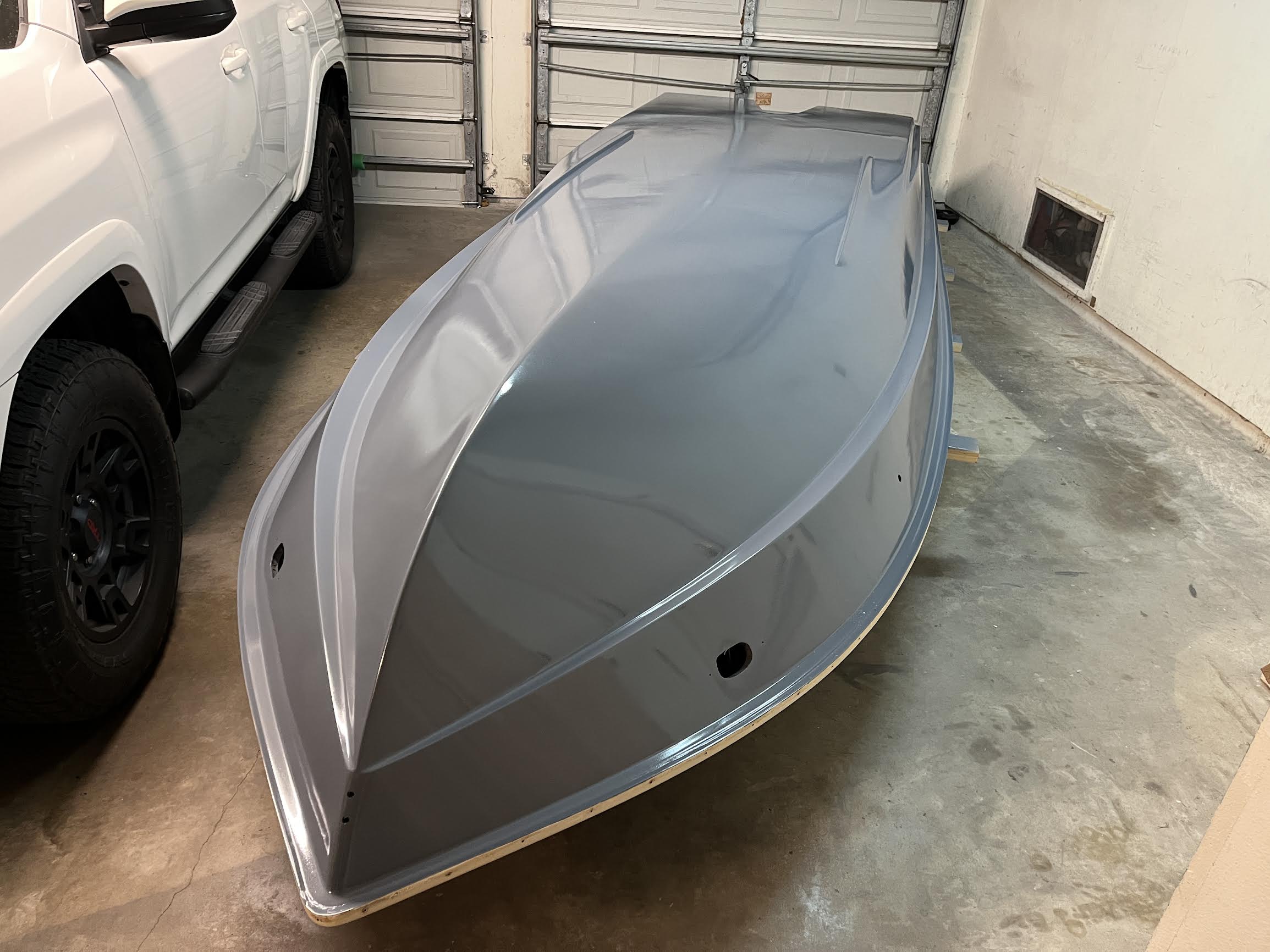 She got stripped, sanded, faired, primed, painted (charcoal gray), and flipped back over to start the inside.