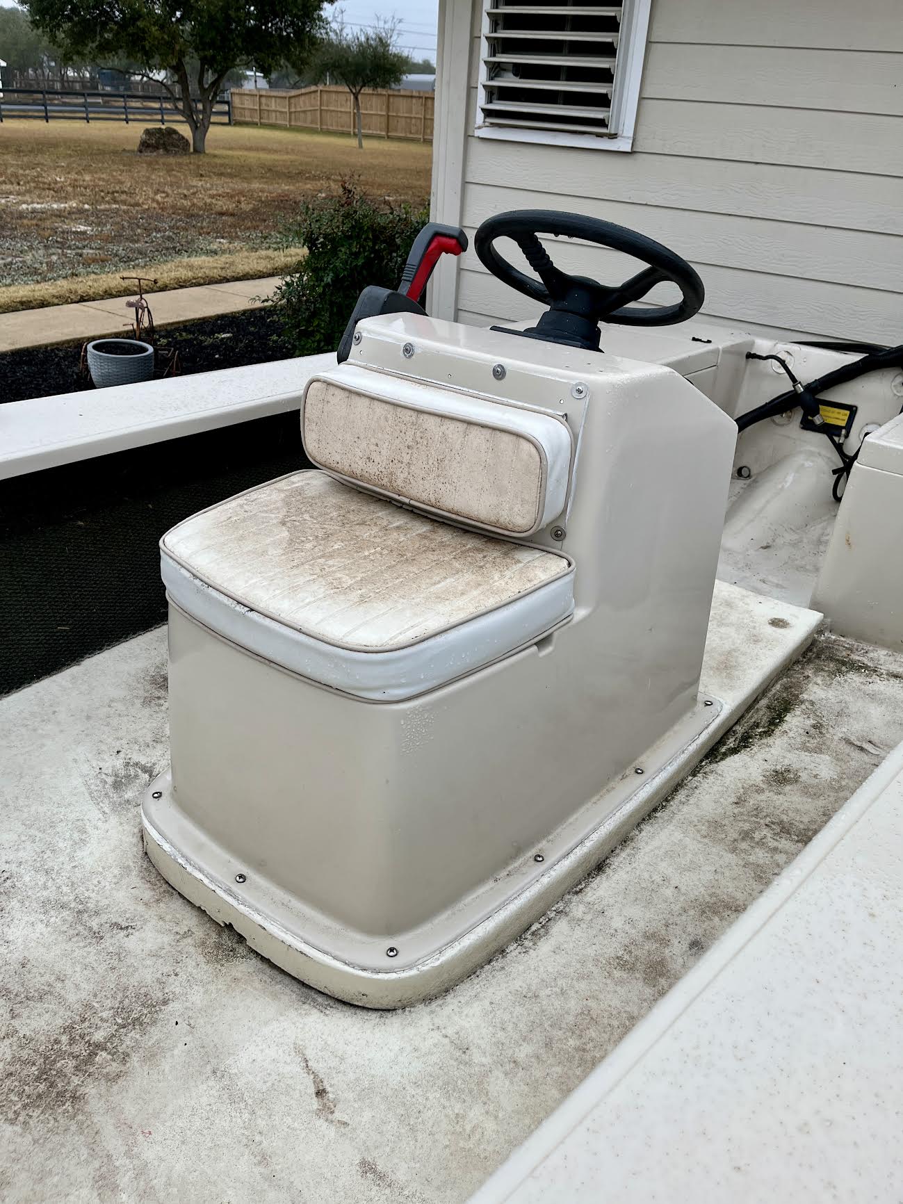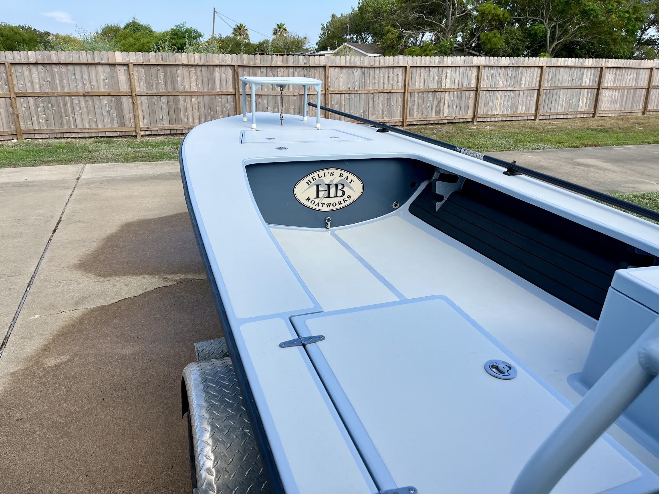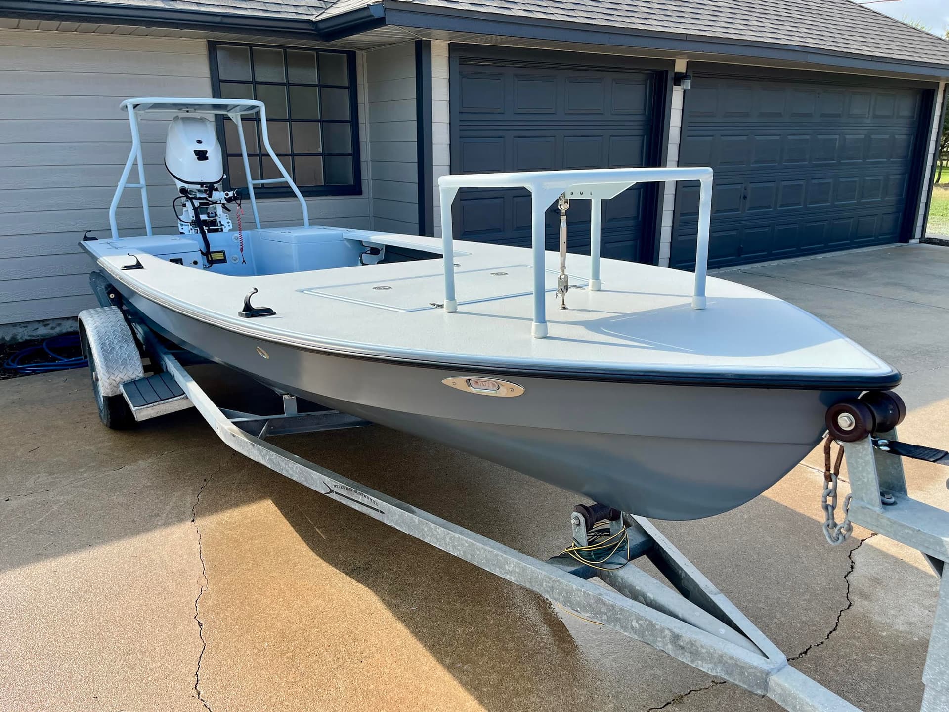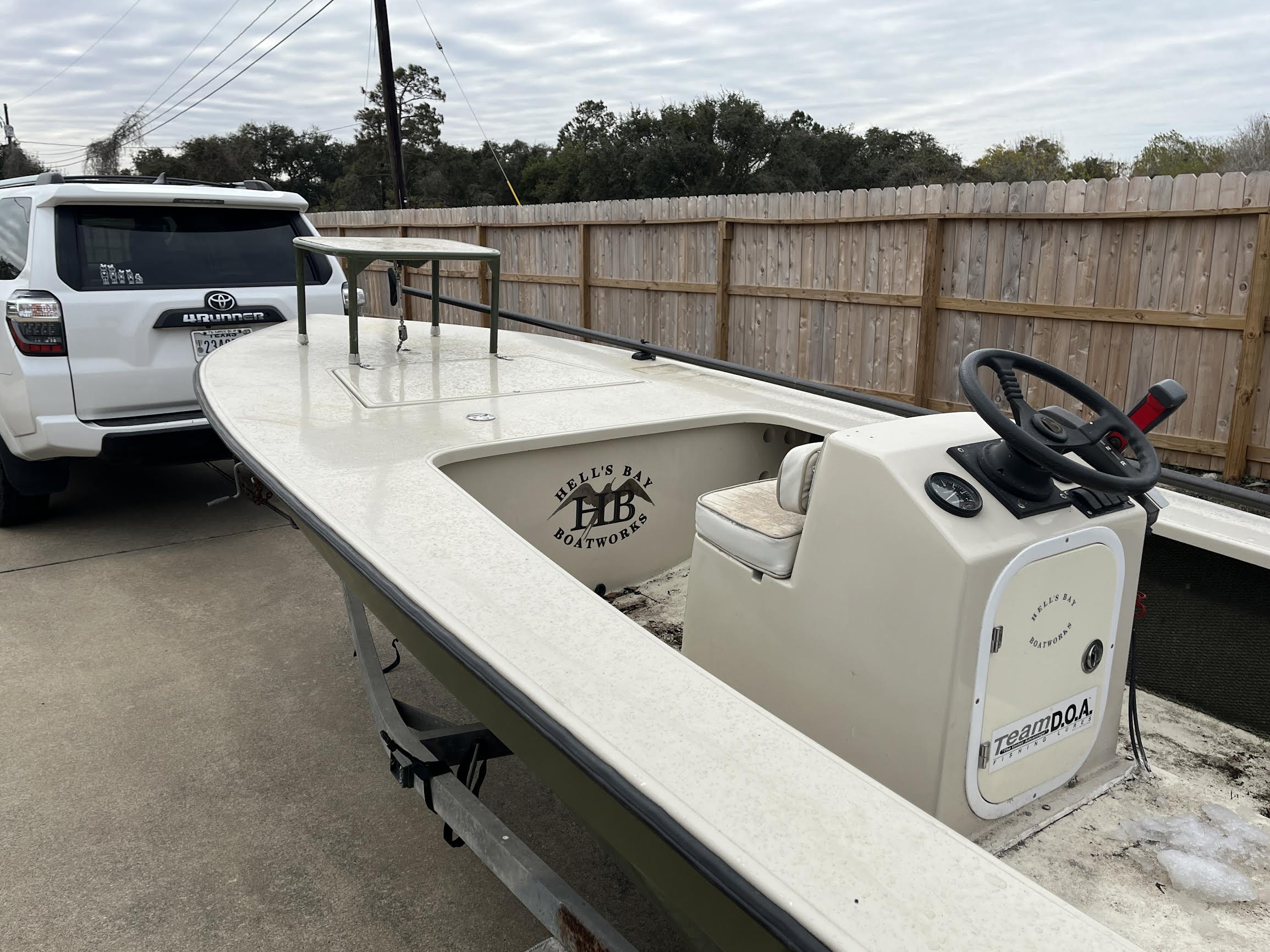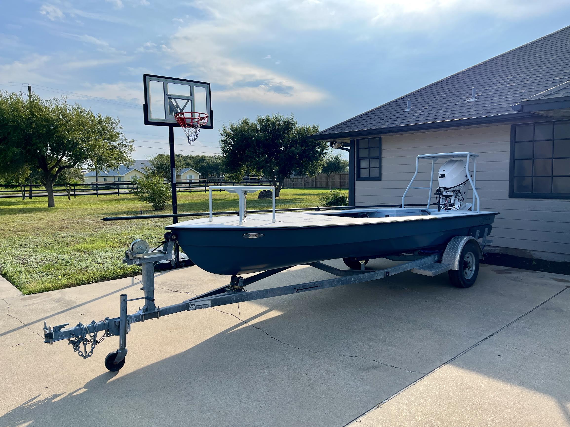 I’m posting this to chronicle my experience buying and refitting a vintage Hell’s Bay skiff. To start I’ll say I’m not a professional and way more of a learn as you go type of guy. Yes I make tons of mistakes and I learn from them and that’s the important part. I’ve wanted a Hell’s Bay skiff since the first one hit the market. This is my first Hell’s Bay but not my first boat or skiff. I found her right here in Corpus Christi, she had been sitting in a back yard for 14 plus years. The previous owner had taken a vintage tiller steer skiff and added a small false floor and center console. We settled on a deal and I drug her out of the weeds and brought her home.