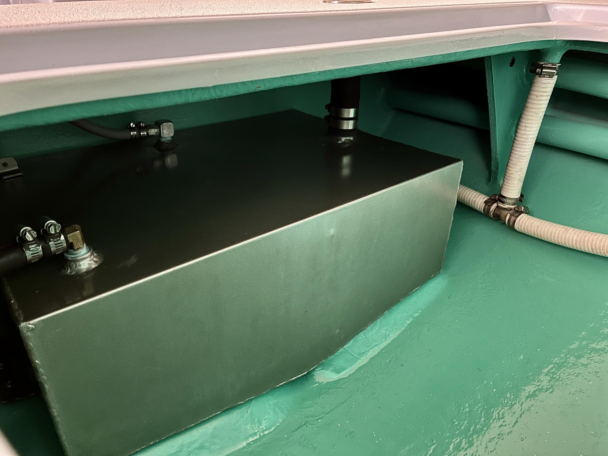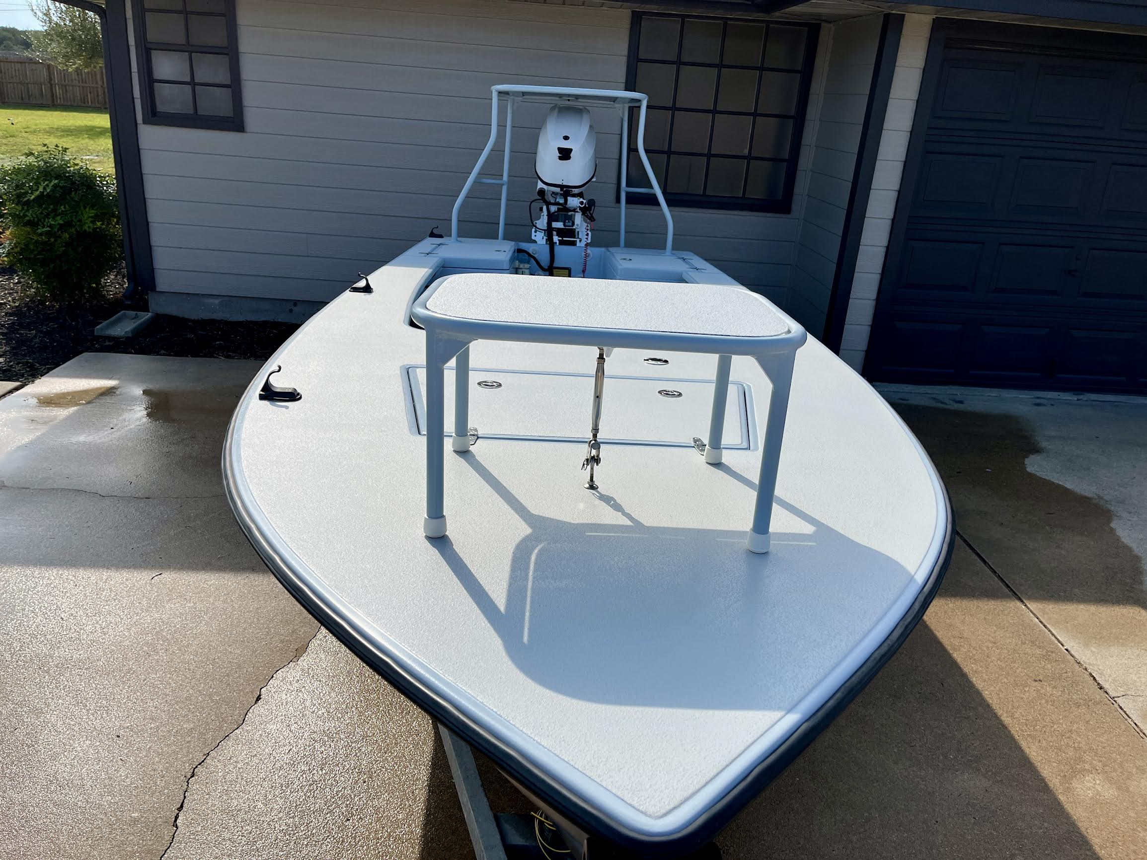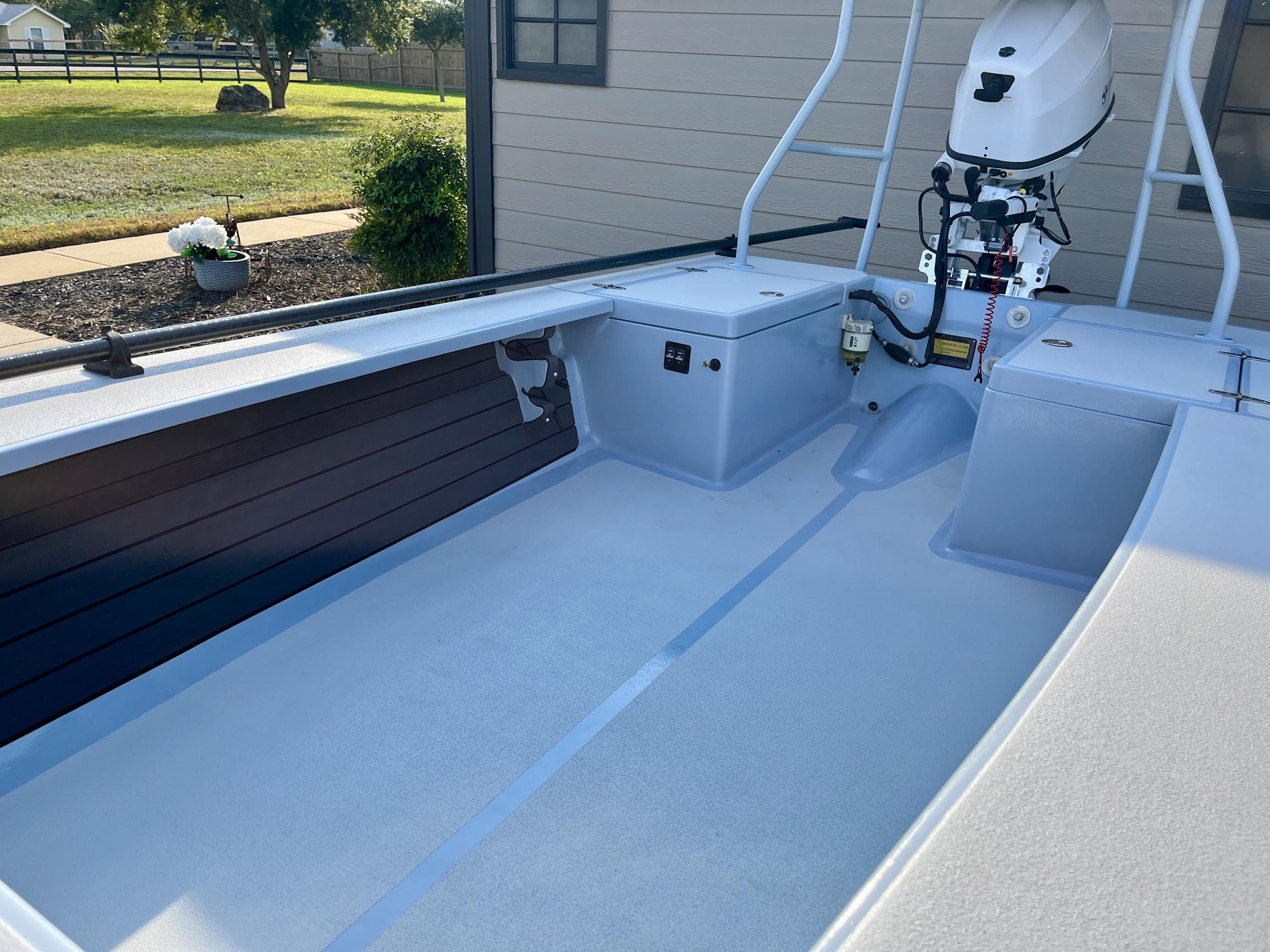 I decided I wanted to take her back to her original self. Removing under gunwale carpet and sanding glue is so much fun I hope I never have to do that again. Repaired all the unnecessary holes. Sanded, primed, painted (Kingston gray), rolled on nonskid (Seattle gray), reused rub rail and hardware, but added hatch latches. Installed Tohatsu 30hp tiller, atlas micro jack (that is getting HMP’s upgrades and will be getting replaced by HMP’s jackplate as soon as Tyler has it ready), Lenco trim tabs, Odyssey battery, new fuel tank, all new rigging fuse panel, etc.